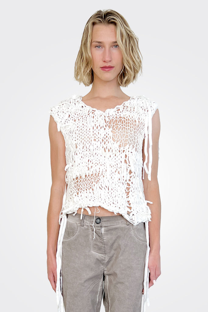 – hand-knitted openwork– irregular knits and structures, featuring various yarns, raw strips of fabrics and trimmings– distressed look– every piece is unique– 100% cotton
