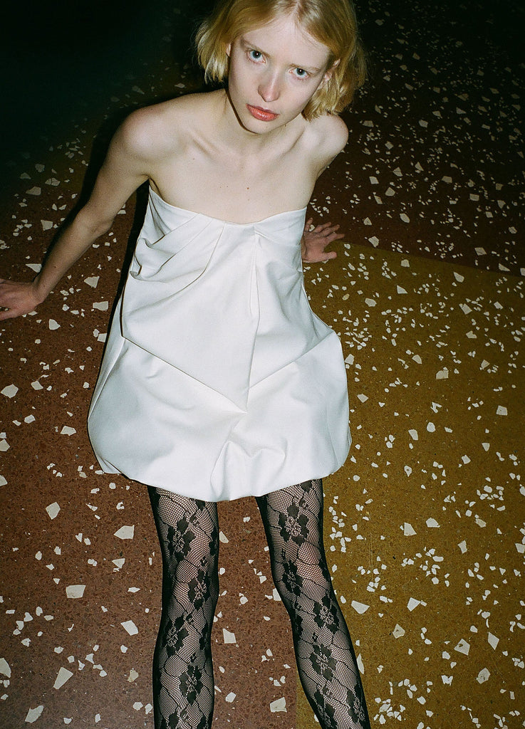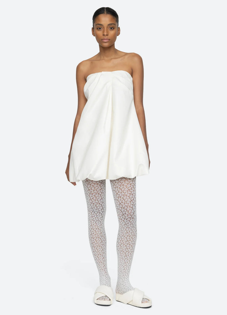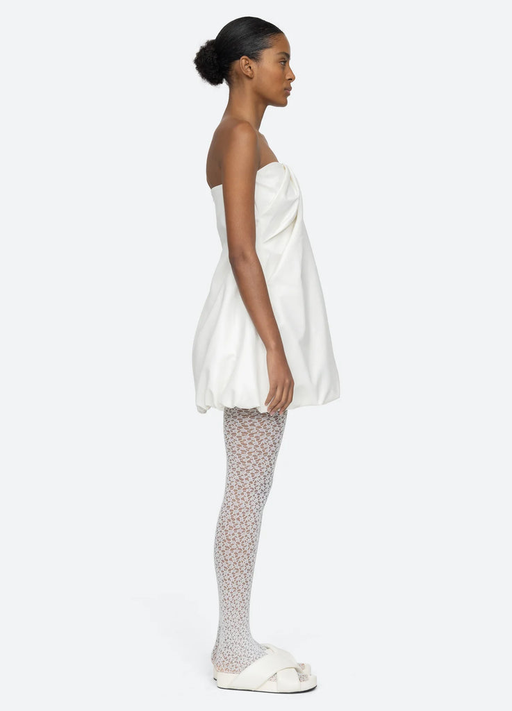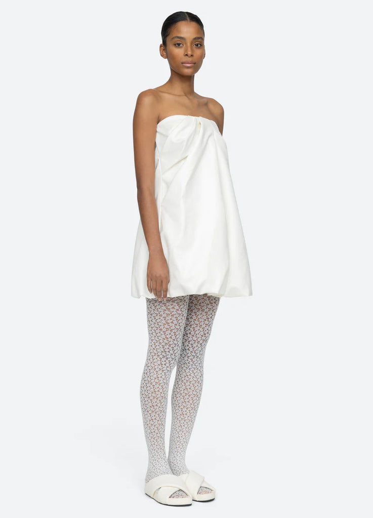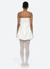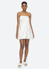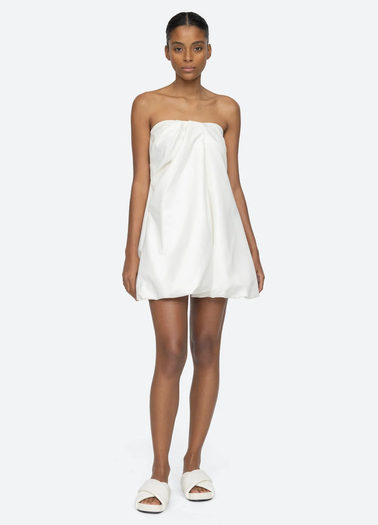The Aerin strapless mini dress features a sculptural neckline with delicate draping and bubble-hemline.