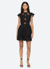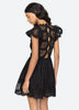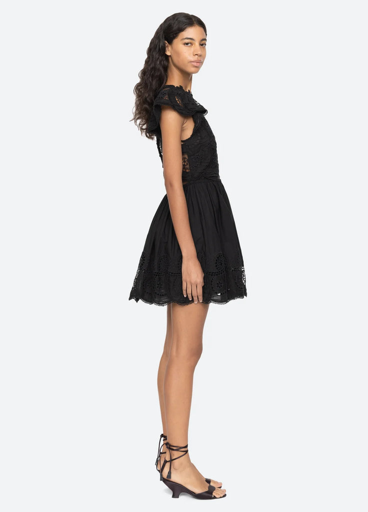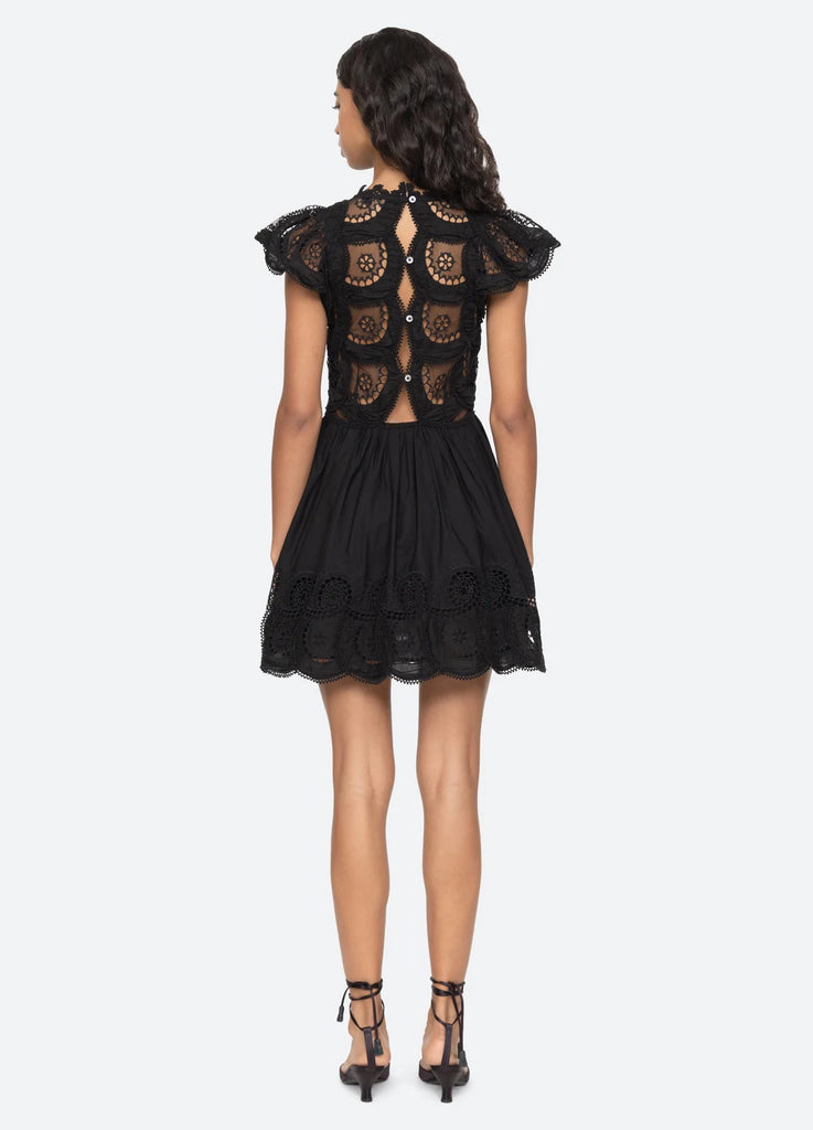 The Drea embroidered mini dress features embroidered detailing throughout, flutter sleeves, sheer accents, scalloped hemline and mini silhouette.