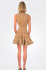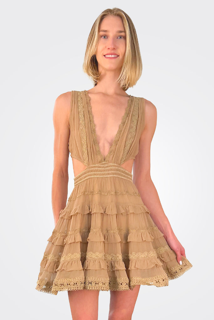 100% viscose. Made in India. Dry clean. Partially lined. Hidden back zipper closure with elastic waistband. Plunging neckline with waist cut-outs. Crochet detail throughout.