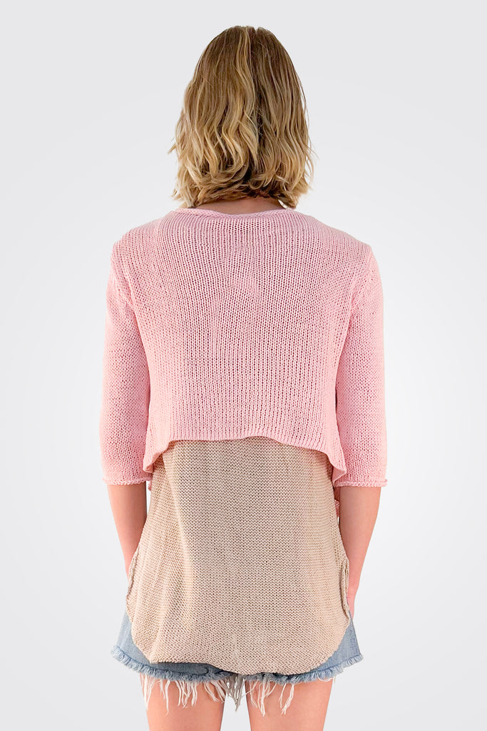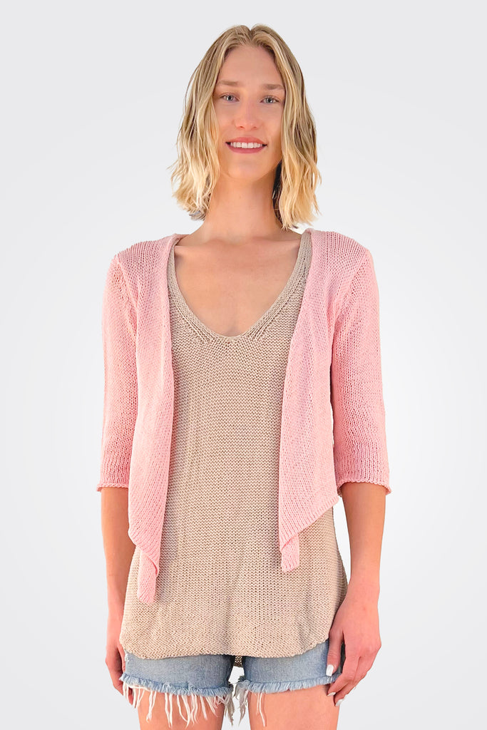 Light, soft, ropey cotton blend with an airy construction keeps you comfortable all year long. This cropped top features a flattering 3/4 length sleeve. A true Wooden Ships classic because of its versatility and ease of fit. Can be worn draped open or tied.