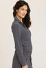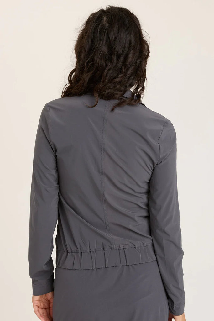 Maximum performance meets the Momentum Jacket in flexible Whisper 4-Way Stretch fabric, designed for sweat-resistant movement and easy comfort. Momentum features allover ruching on the front, an elastic cinched hemline, and a belted buckle detail at the collar for some added chic. Wear for movement or style with a casual bottom for sartorial excellence! Activewear never looks so stylish!