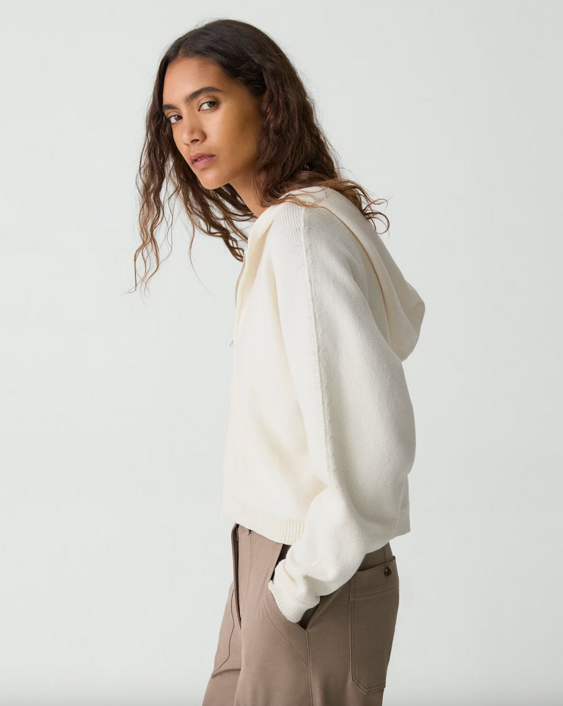 Performance meets comfort with our zip-up hoodie, crafted from a soft, sophisticated cotton blend. Cut for an oversized fit, its slightly cropped length adds a flattering proportion to the silhouette. Made using stuffed cotton yarn sourced from Italy, it gives body to knit stitches but is still lightweight.