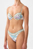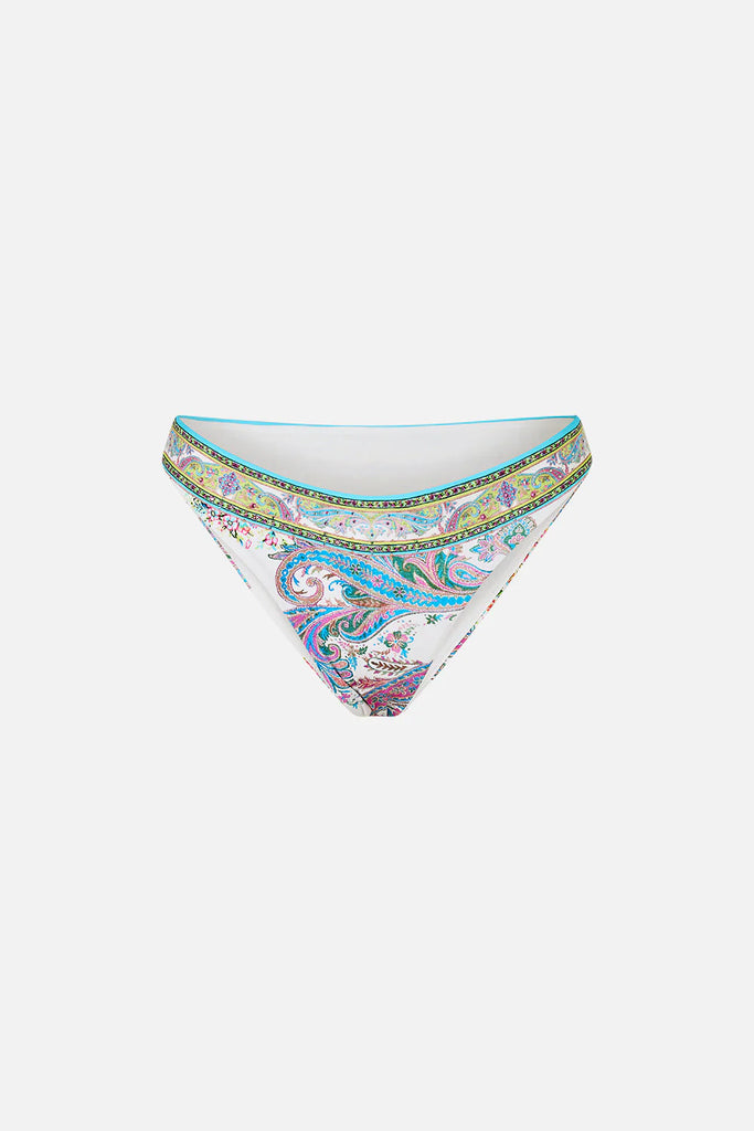 The Magic Carpet Ride Mini Regular Bikini Bottom is a handcrafted ECONYL silhouette designed by our in house artisans. Reimagined in an exclusive limited edition print, this bikini bottom is cut with a cheeky thin side design which offers a regular to low leg line and regular rise and moderate coverage. It features soft edges and is finished with intricately placed crystal embellishments for luminous detail.