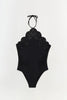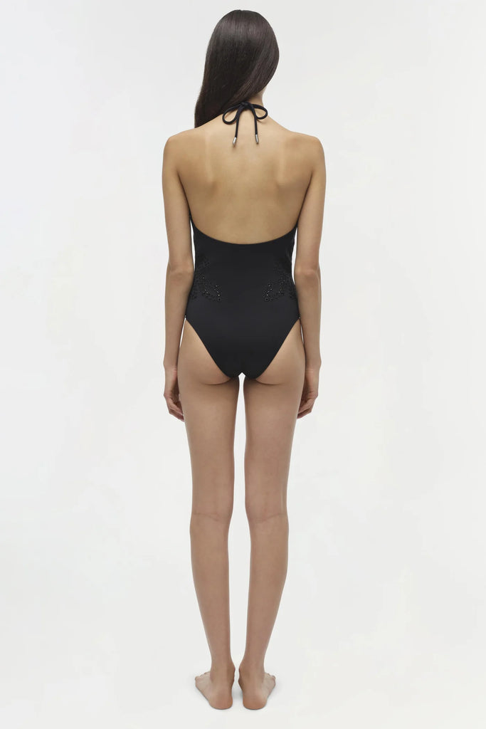 The Nicolette Halter Embroidered Swimsuit in Black. Showcasing intricate broderie anglaise detailing, this one-piece swimsuit blends functionality with timeless elegance.