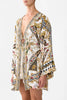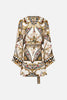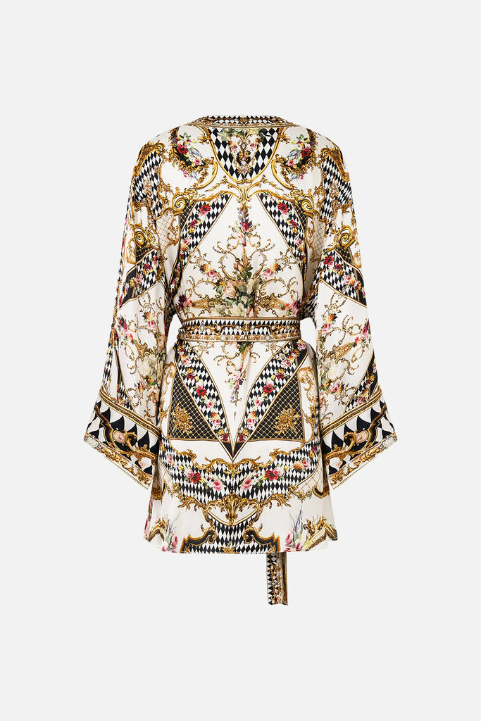 Designed in Australia, The Rococo Glow Short Kimono Wrap features framed florals, ornate borders, and intricate ceiling and floor details that capture the regal elegance of the Palace of Queluz. Lovingly handcrafted, this stunning luxury outer wear layer is home to a relaxed fit body with and open neckline designed to be worn open or wrapped and cinched in with the contrast waist tie. The slight drop shoulder leads into wide statement kimono sleeves that dance at the wrists with wide contrast cuffs.