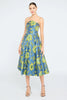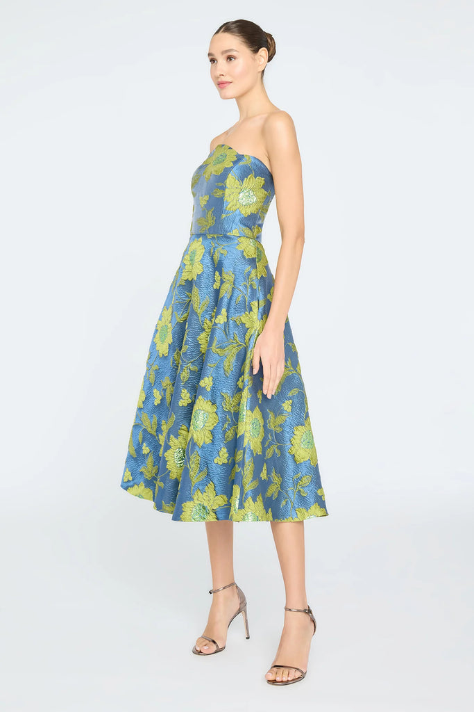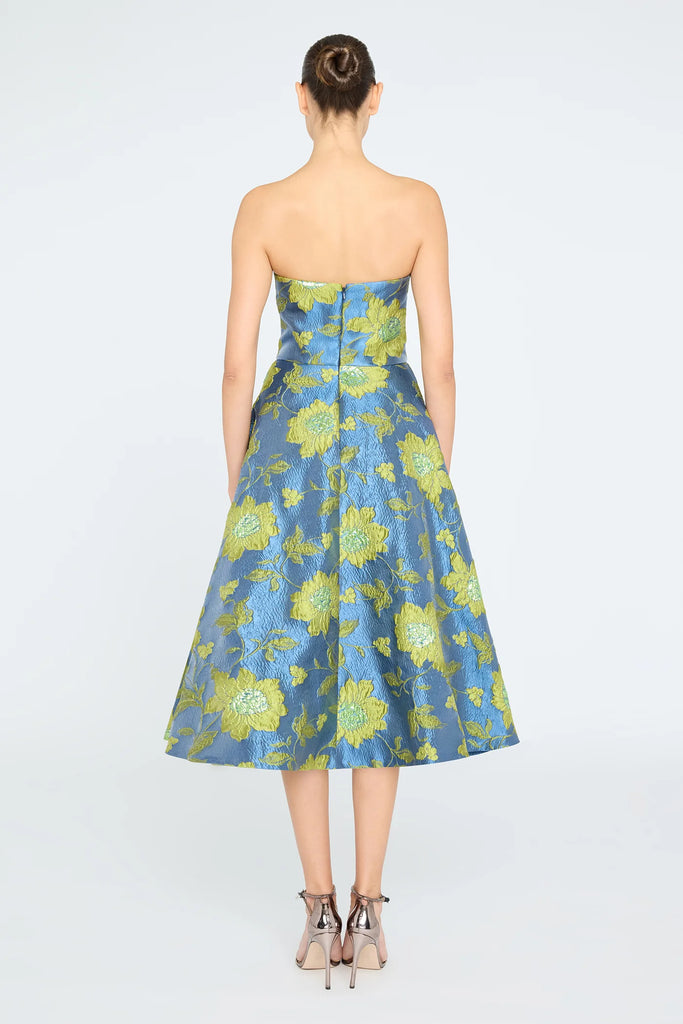 Bright, bold, and built to twirl. This strapless jacquard dress pops in vibrant florals with a scalloped neckline and flared A-line skirt. An exquisite choice for garden parties, cocktail receptions, and elegant summer weddings.
