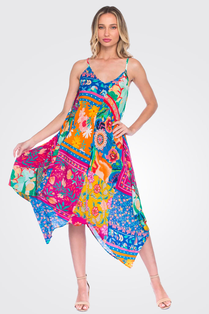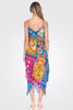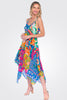 The Drew dress is designed and cut to create beautifully elegant drape on the body. Tonal, neutral shades are artistically layered with vibrant, bright colors creating an exciting Spring pallet