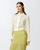 Women's shirt made from very lightweight georgette and sporting a special bomber jacket-evoking design: cropped cut, set-in sleeves with cuff, elasticated hem and metal press-stud and flap fastening. The adjustable drawstring at the bottom—visible at the back—allows you to cinch the volume of the shirt and tailor the fit. This garment offers a fresh, original and stylish take on the wardrobe classic that is the women's shirt, giving spring looks even more character.