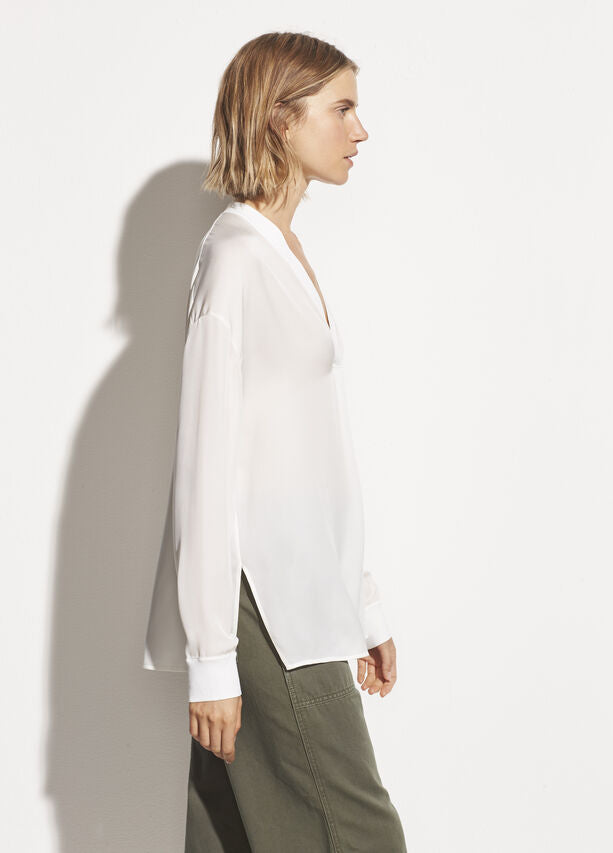 An effortless blouse in silk georgette with a V-neckline and slight V-back. The romantic, airy silhouette has tonal rib trim detail.