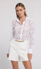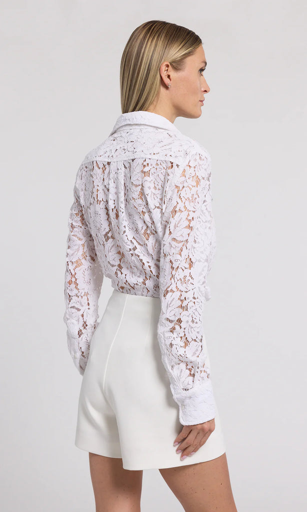 Sheer lace redefines the classic button-down with a daring, contemporary edge. Whether styled with sleek pants or a miniskirt, this statement piece balances bold design with effortless sophistication.