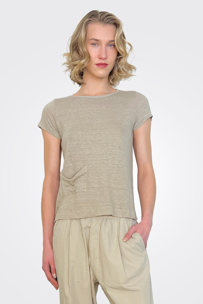 This slim-fitting white tee features a pocket front made of soft linen fabric.