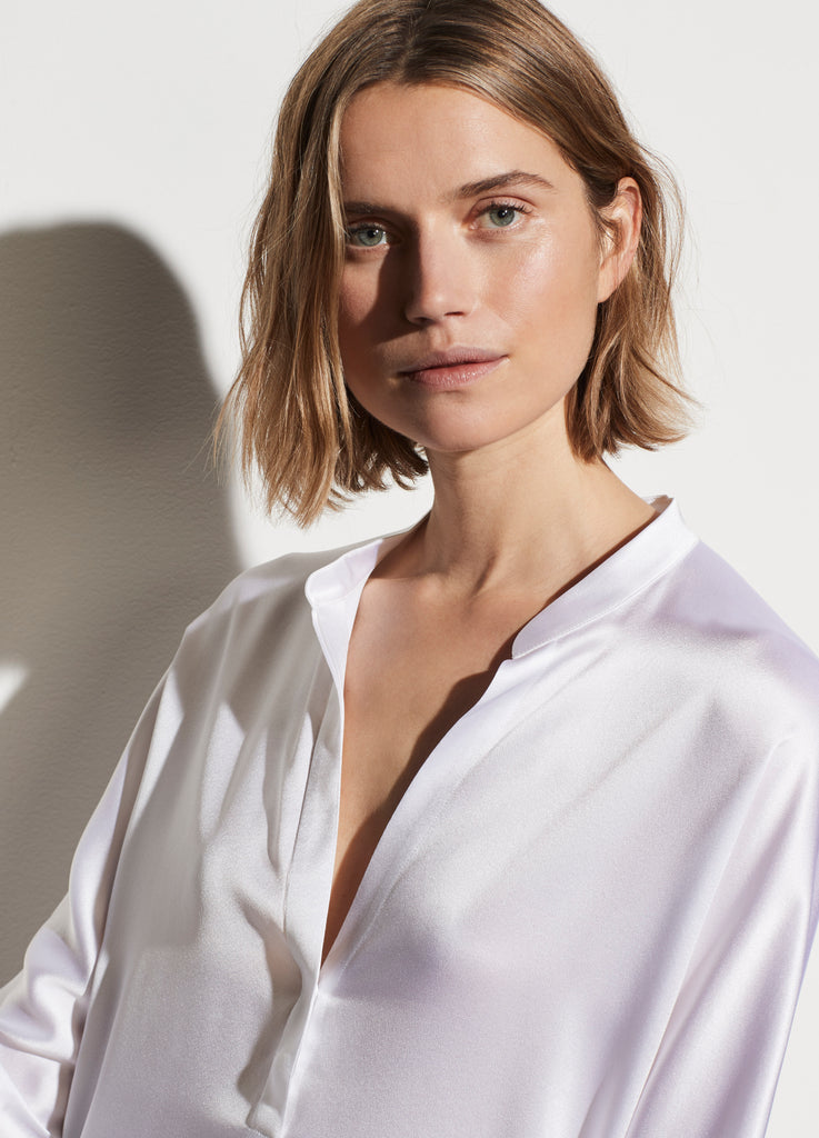 An effortless popover blouse in smooth satin with a band collar, split neckline, and long sleeves.