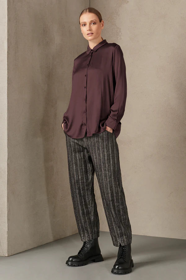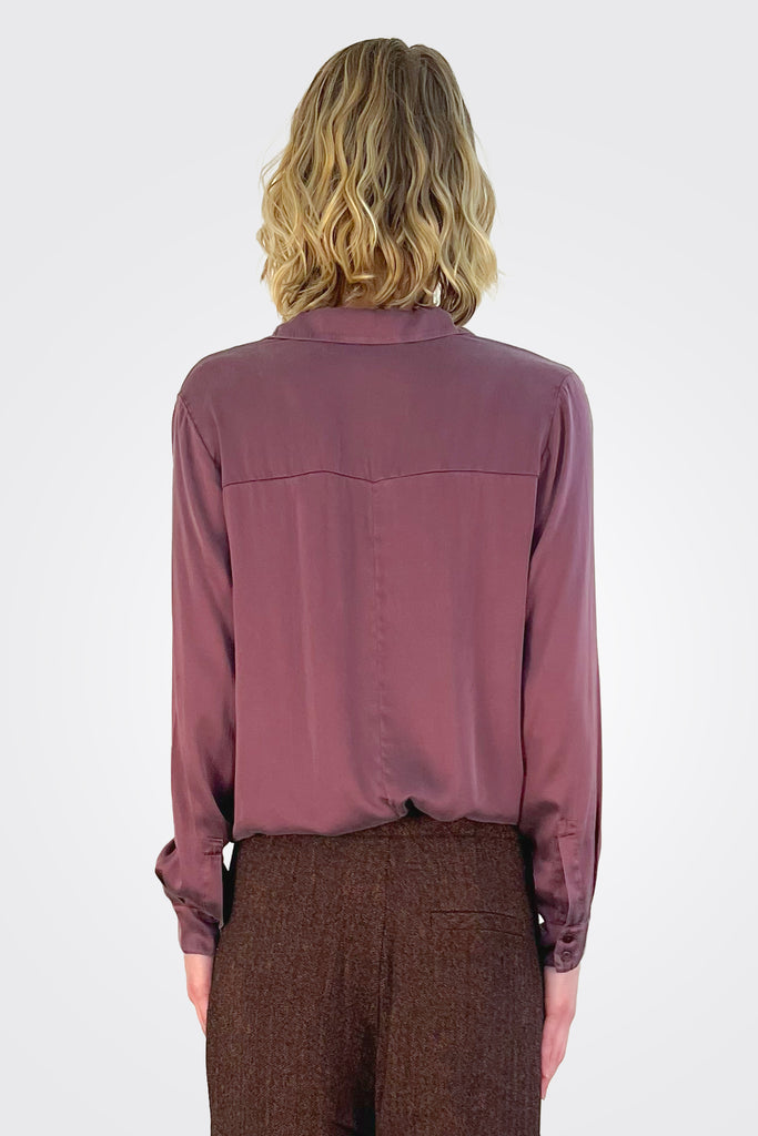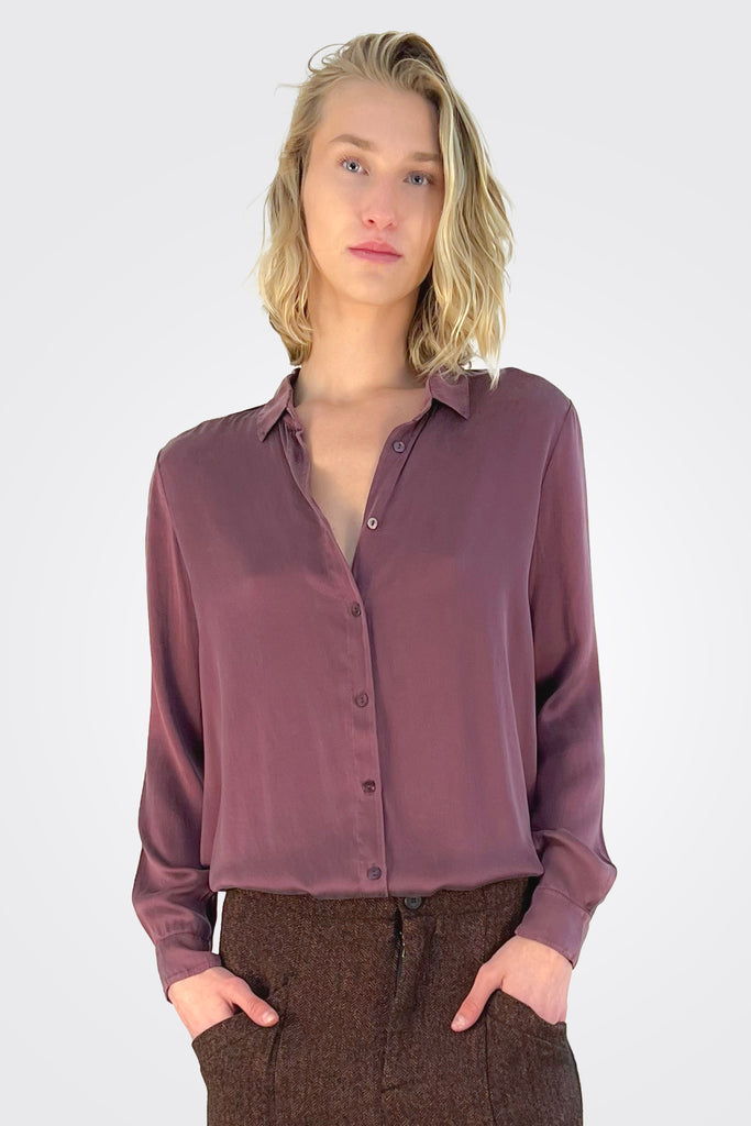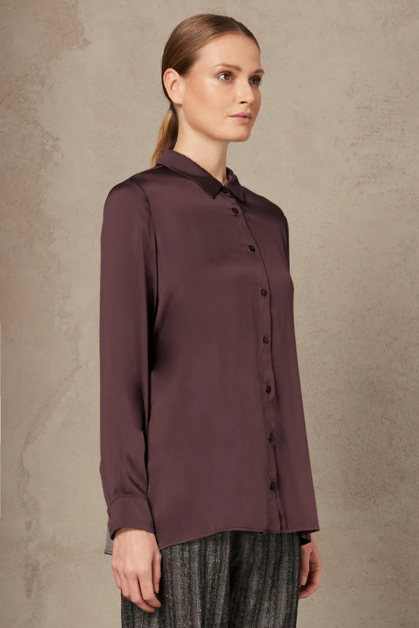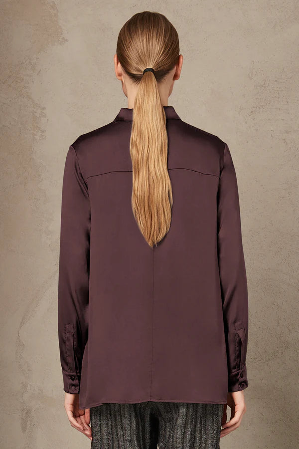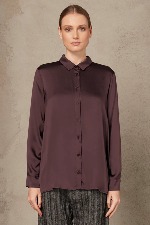 Garment dyed basic shirt made of stretch satin silk. Regular fit, straight outline. Shirt collar and fastening with buttons. Cuffs opened by two buttons. On the back yoke and central cut.