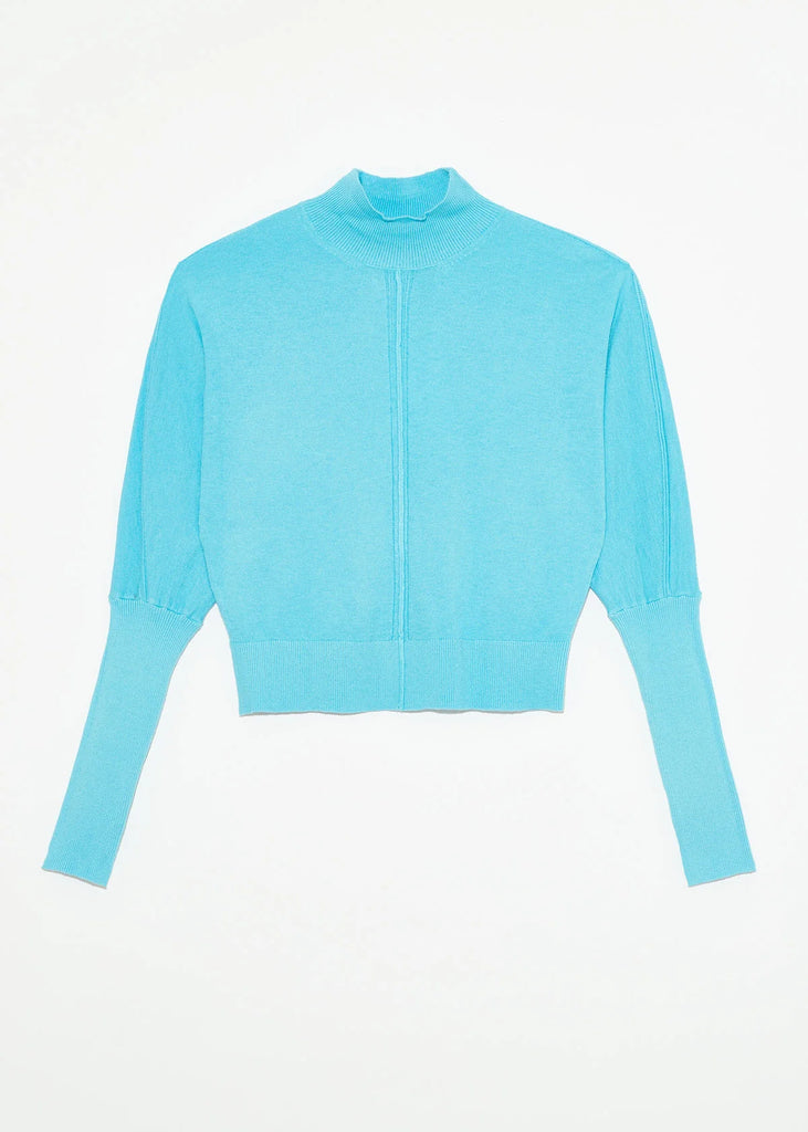 Viscose blend turtleneck sweater with long batwing sleeves. High cuff on sleeve with slits at the sides. Detail of visible seam on front, back and sleeves