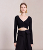 The Hallie Cardigan is knitted from a ribbed viscose blend. This cropped silhouette features long sleeves and a V-neckline with three buttons that conceal a bra when secured.