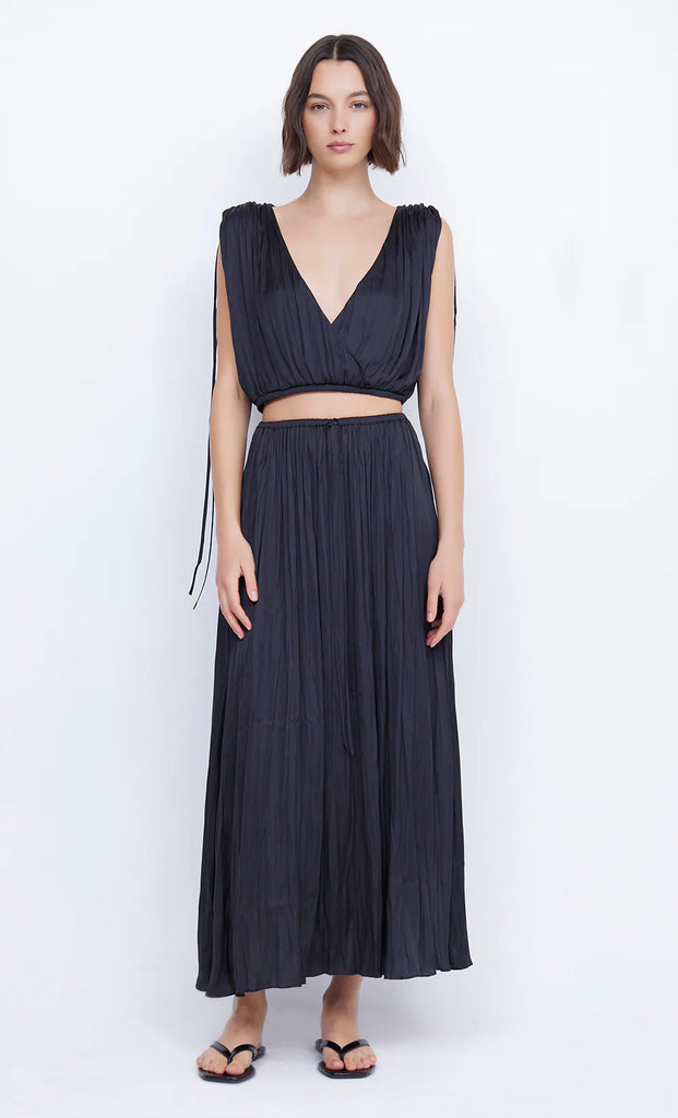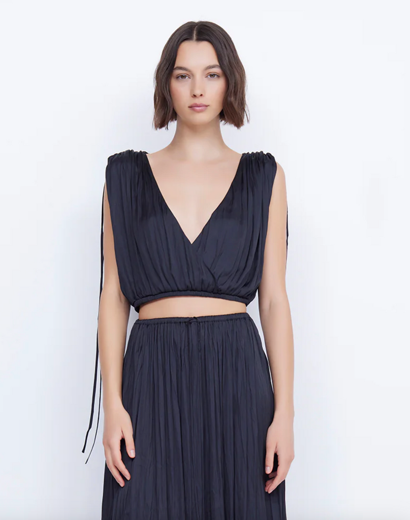 The BEC + BRIDGE Louann Wrap Top is crafted from a lightweight fabric in a relaxed silhouette. The sleeveless crop features a deep v neckline, wrap front, gathering at the shoulders with self ties and an elasticated hem.