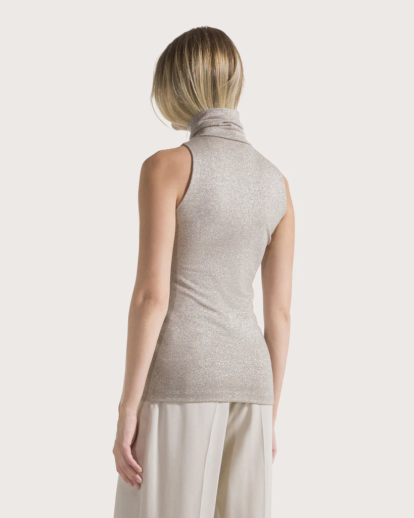 Lurex jersey sleeveless turtleneck with tight-waisted fit.