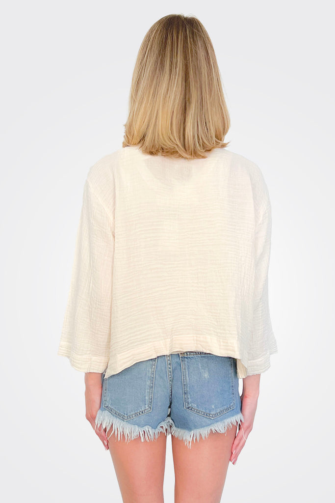 Our Cotton Gauze fabric is made of soft 100% natural cotton fibers that make it breathable, hypoallergenic and light-weight. It is woven using a special technique that involves twisting horizontal warp threads around the vertical weft threads, resulting in a soft, crinkled, and loosely-woven texture with a slight vertical stretch. We focus on having minimal environmental impact by carefully selecting materials like this Cotton Gauze, as it is a wonderful long lasting material and local to our artisan maker’s region.