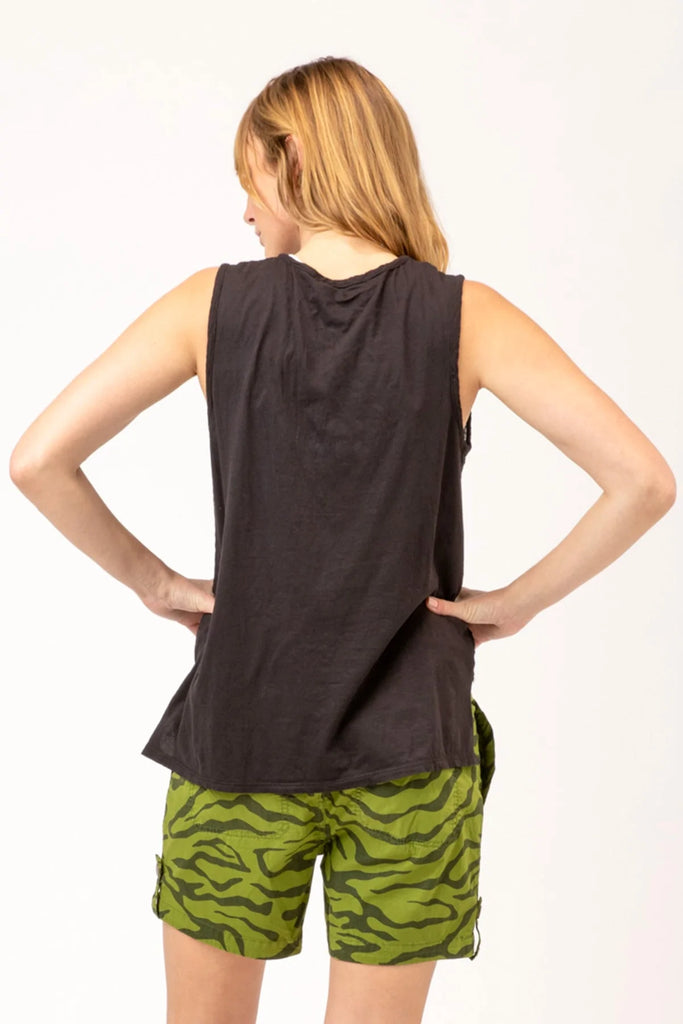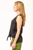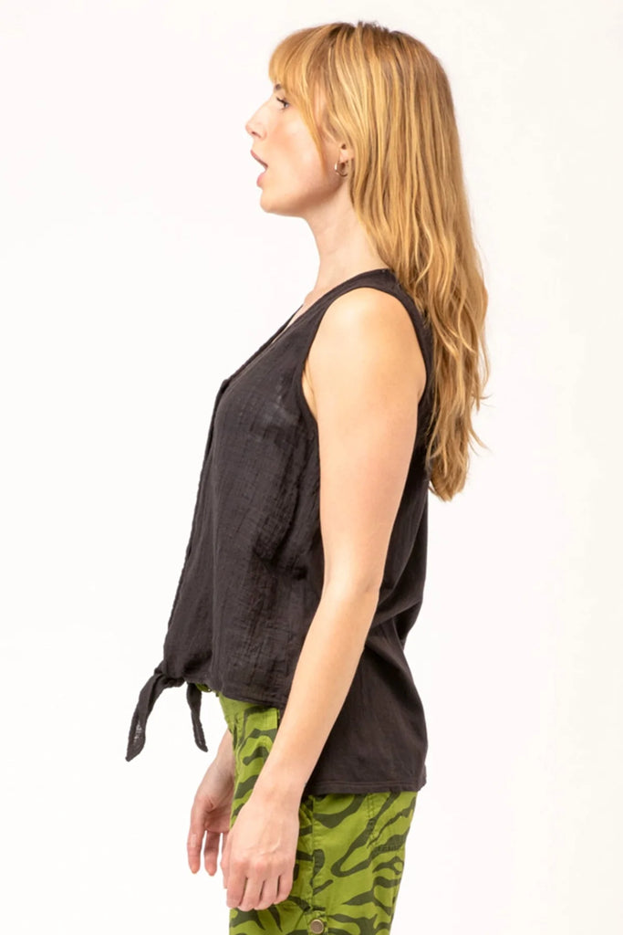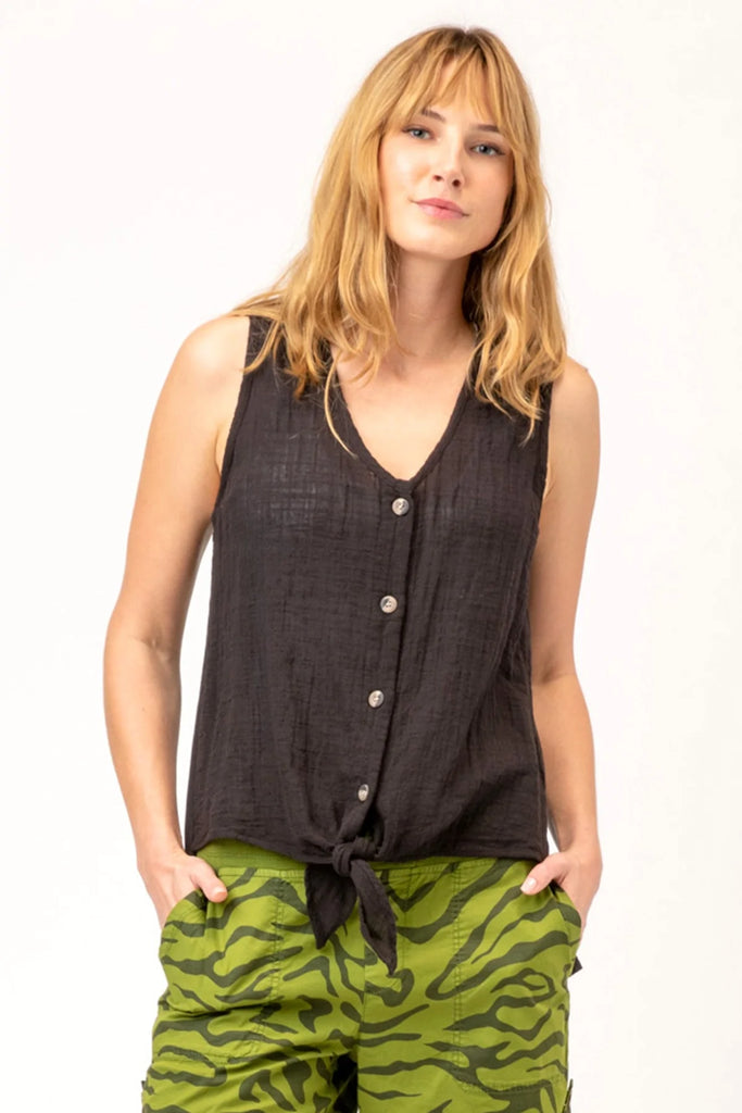 A cute sleeveless, bra-friendly top which features a button-down v-neckline with a front tie, a square high-low back hem.