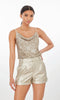 Soft stretch sequin top absolutely sparkles with elegantly draped cowl neck and adjustable spaghetti straps. Fully-lined in lightweight mesh for the ultimate in comfortable chic.