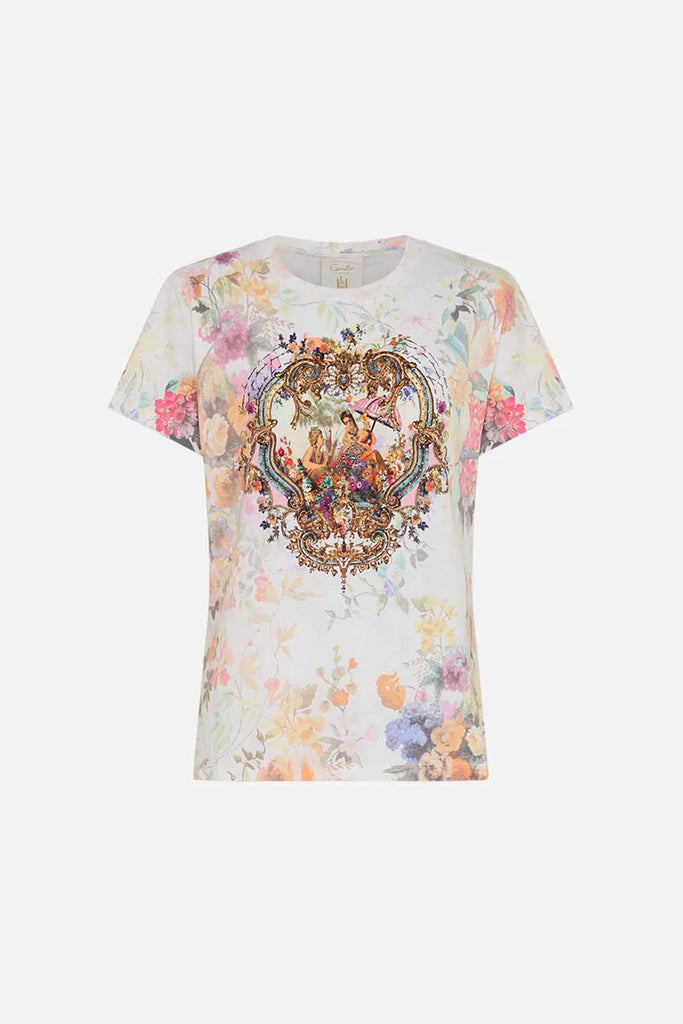 The Friends With Frescos Easy Tee captures the exquisite ambiance of the grand Hotel Villa Cora. Soft flowing curves guide us along opulent mosaics in a rich tapestry of pretty florals and baroque accents. Crafted from breathable cotton, this luxe trans-seasonal tee features custom all over print, shorter length sleeves, a timeless crew neckline that falls into a relaxed easy-fitting silhouette. Pair with the Friends with Frescos Minimal Wide Leg Pant for chic casual styling. Lovingly handcrafted, designed in Australia. Explore more from the Amore Mio collection.