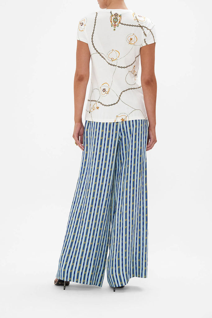 The Amalfi Lullaby Organic Cotton Slim Fit Tee depicts the beautifully bright exuberance of the Italian coastline, capturing the essence of seaside summer bliss. Crafted from breathable cotton, this statement tee is home to an elegant round neckline, embellished with CAMILLA crystals, cropped sleeves, a relaxed slim-fit silhouette finished with ribbed accents at the neckline. Wear tucked into the Amalfi Lullaby Scarf Belt Wide Leg Pant for a chic longline silhouette. Lovingly handcrafted, designed in Australia. Explore more from the Amore Mio collection.