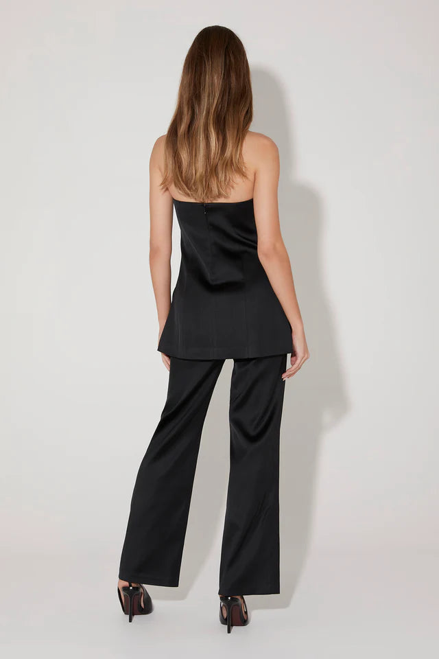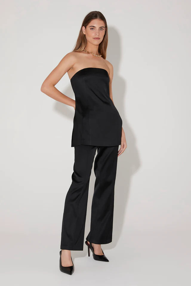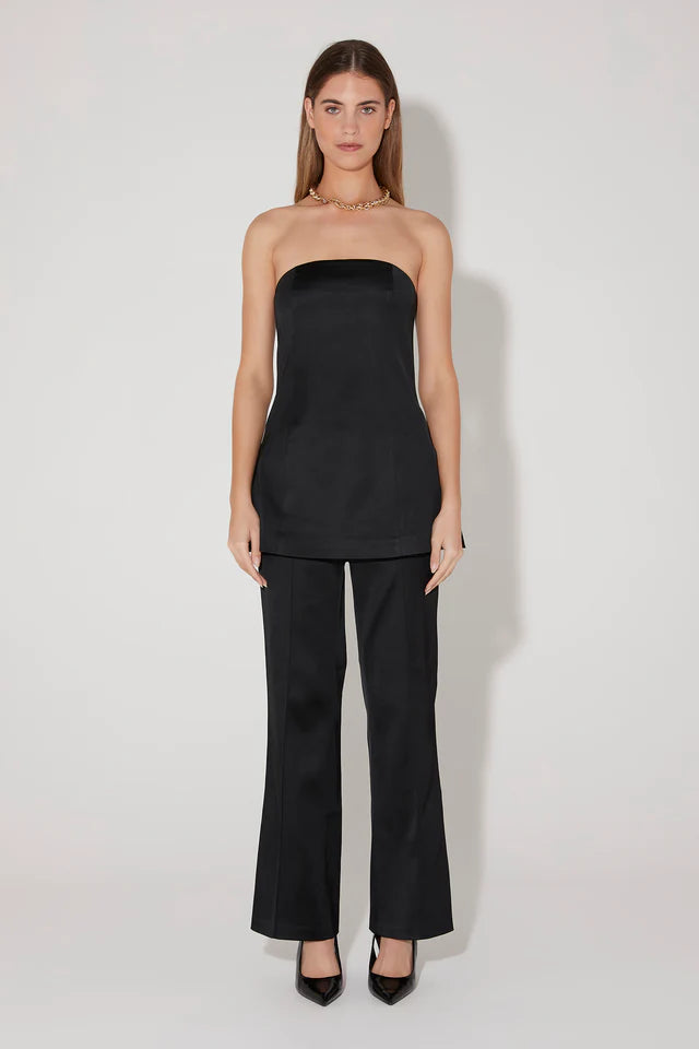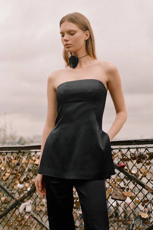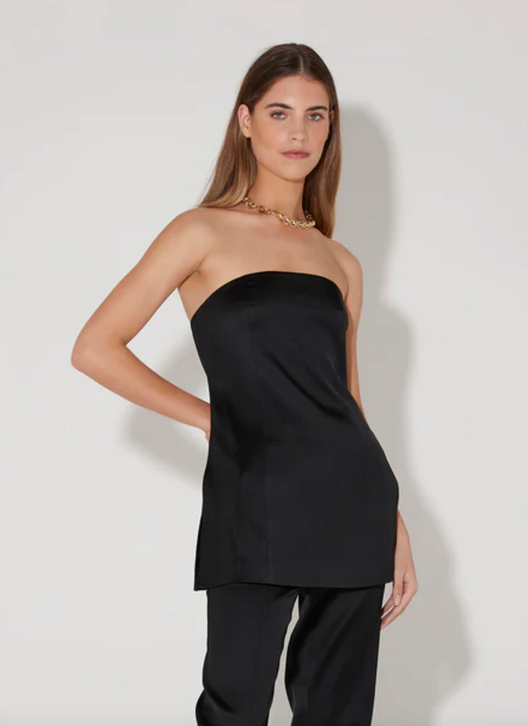 The Orsun Top is our gorgeous new statement suiting strapless top. The body is accentuated with slimming panel lines, a curved neckline and high side splits to give you styling versatility. Please note this suiting has a sheen to the fabrication.