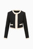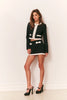 The Ralphette Jacket elevates classic tailoring with a touch of LoveShackFancy opulence. Crafted from smooth, structured twill, this tuxedo-inspired piece features refined contrast banding and sparkling rhinestone trim around the neckline and front sweep for a subtly glamorous finish. Pair with the Edeness Skirt for a full set.