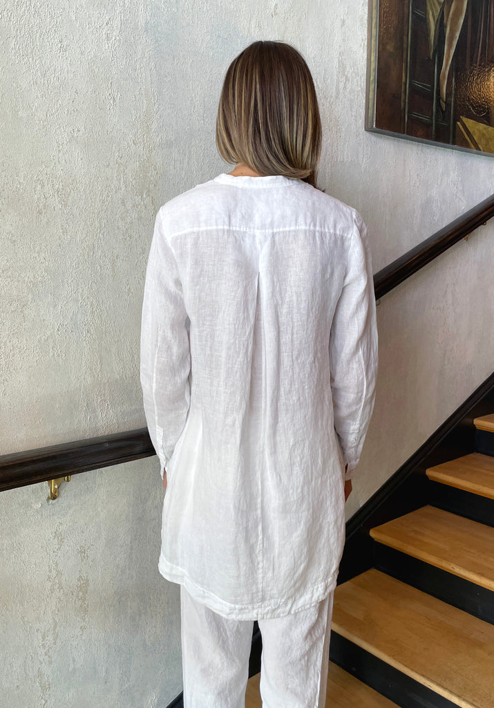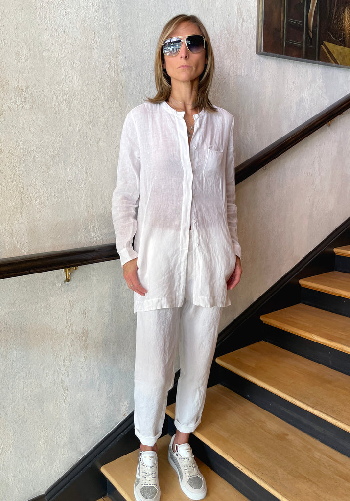 Long-sleeved, light garment-dyed linen shirt. Band collar. Hidden buttons in georgette. Front pocket. Welt side pockets. Three buttons on the cuffs. Yoke on the back with a cut and a pleat.