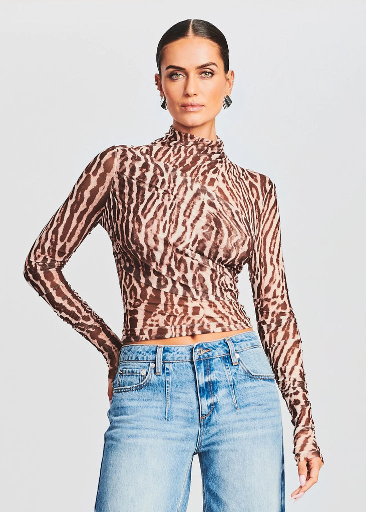Show off your wild side with SER.O.YA's Sana Top featuring long sleeves, a mock neckline, and a daring cheetah print pattern cut in a power mesh fabrication. Shown here in Tan Ocelot.