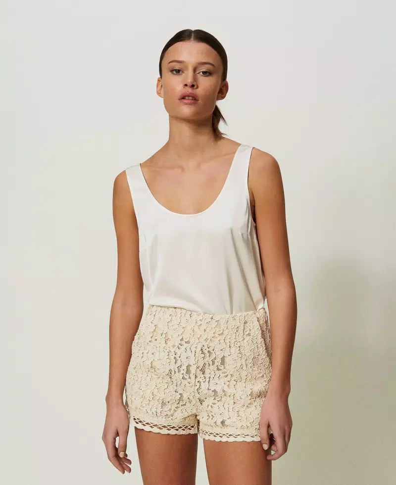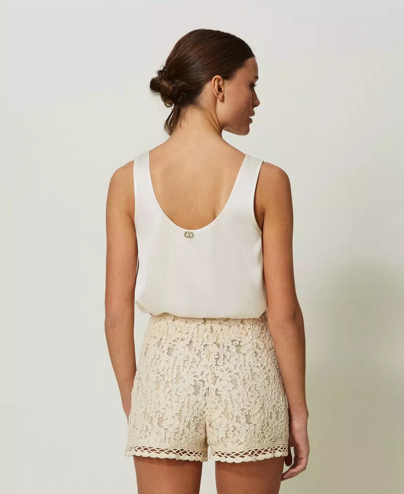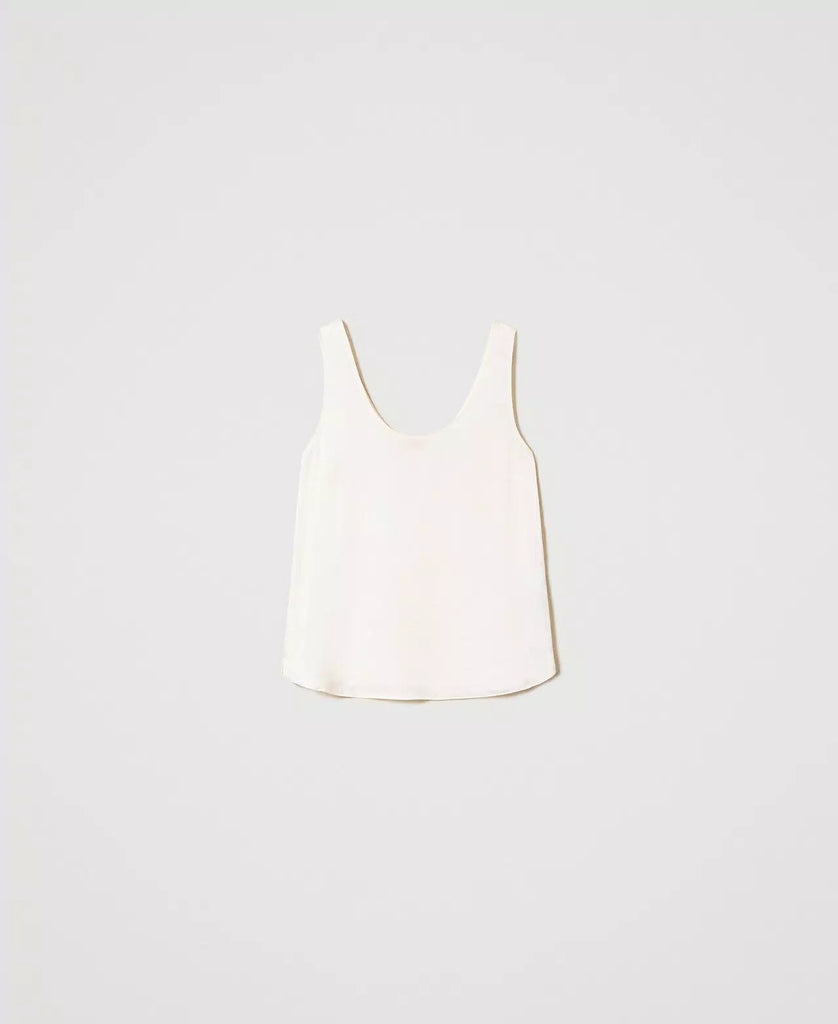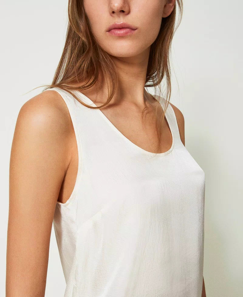 Add to your seasonal range this versatile top you can wear in countless looks. Opt for this light viscose satin top with wide straps, round neck, straight fit, Oval T logo plate on the back and no lining. Under jackets and cardigans in transitional looks and on its own later on in the season.