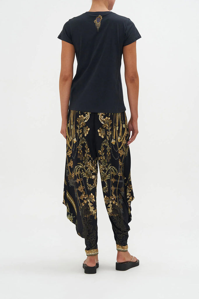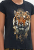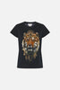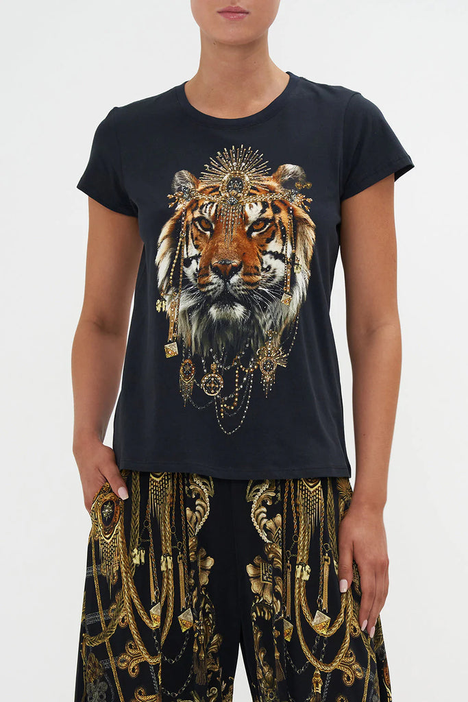 The Night Is Noir Slim Fit Round Neck T-Shirt explores a mesmorising sea of midnight hues finished with our signature tiger portrait dipped in golden adornments.Crafted from breathable cotton, this statement tee is home to a classic round neckline, hand-embellished CAMILLA crystals, cropped sleeves, a relaxed slim-fit silhouette and ribbed accents at the neckline.
