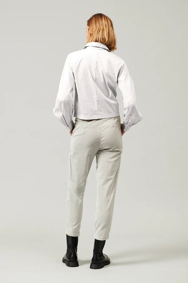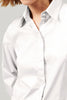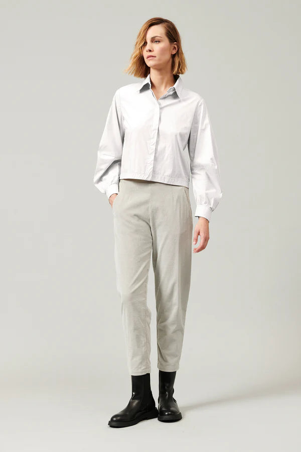 Stretch cotton poplin shirt. Regular collar, hidden placket with mother-of-pearl buttons. Shaped voluminous sleeve, relaxed fit.