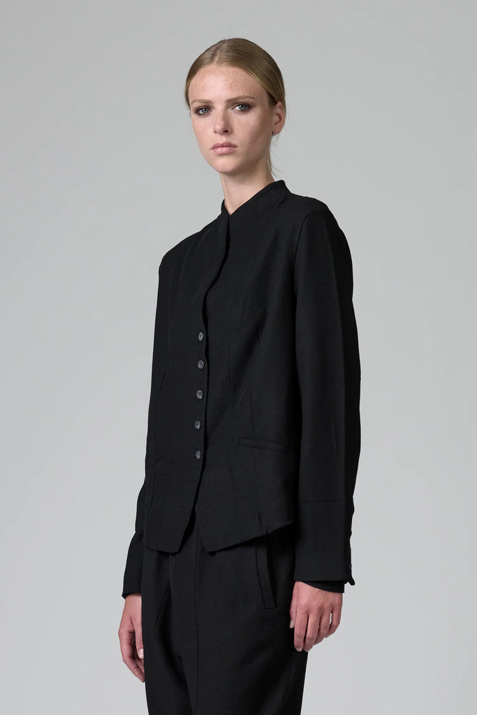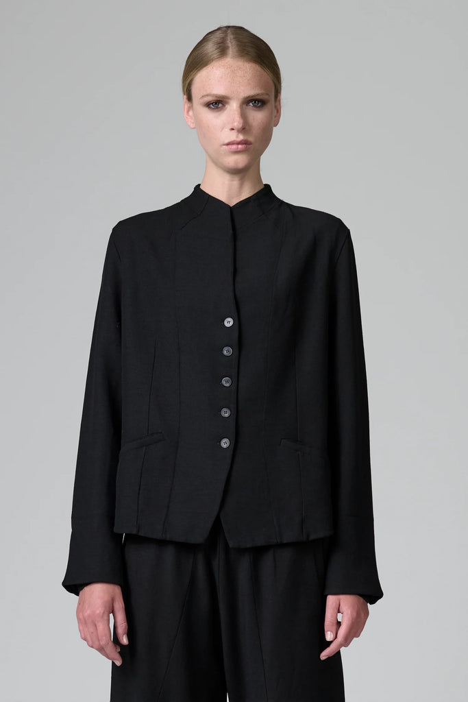 Stretch wool and viscose lined and shaped jacket. Featuring an American-style collar, five-button fastening with a rounded shape, two diagonal welt pockets at the front and vents in the cuffs.
