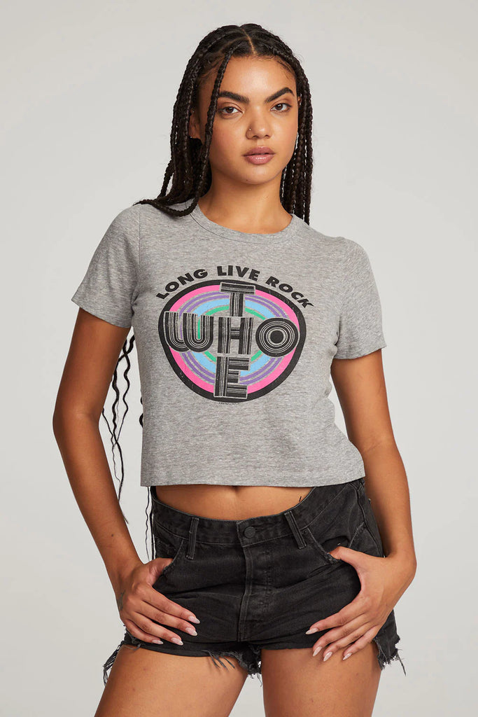 Throwing it back to The Who and their 1979 classic hit in this women's short-sleeved streaky grey top Long Live Rock. Pay tribute to one of the great bands who famously sang, "Long live rock! I need it every night Long live rock! Come on and join the line Long live rock! Be it dead or alive."