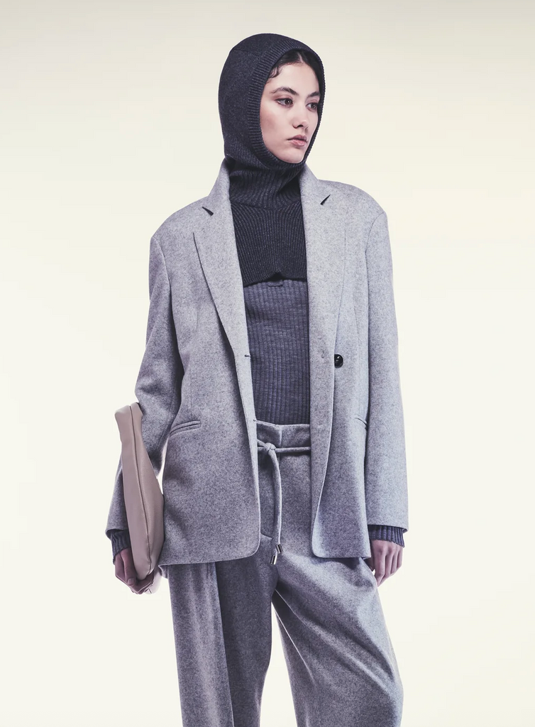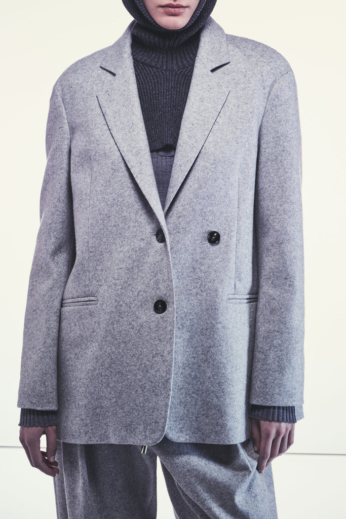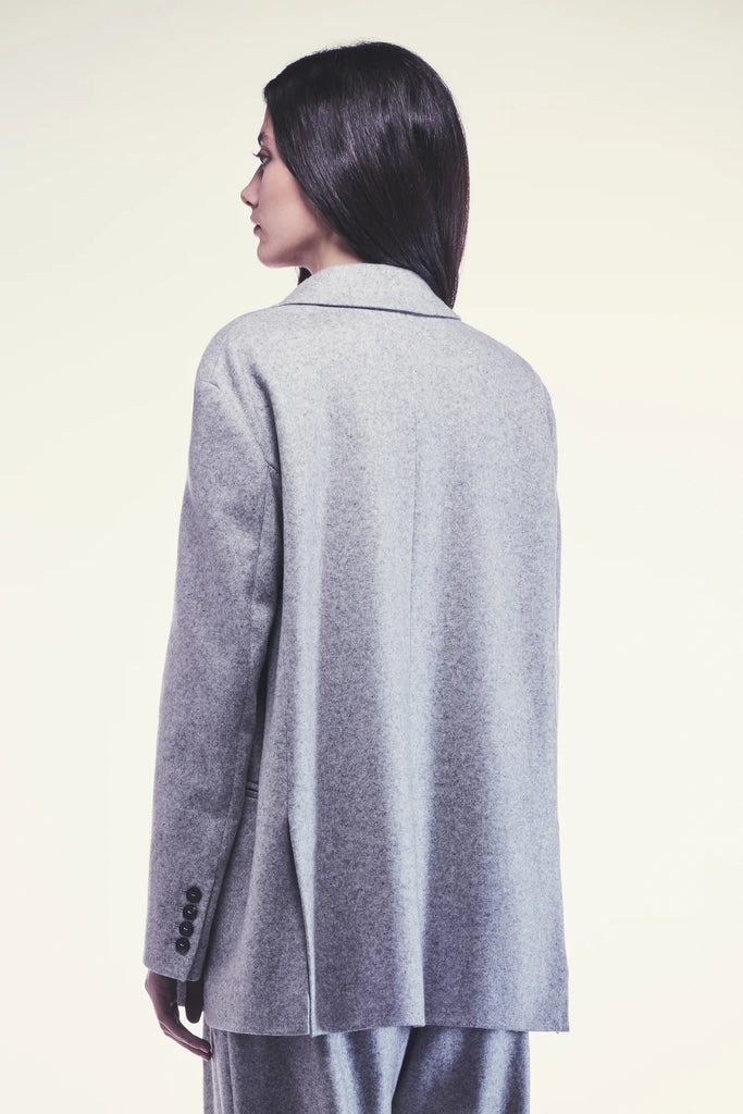 OVERSIZED BLAZER IN LIGHT GREY CASHMERE CLOTH, WITH CLASSIC LAPEL COLLAR AND SINGLE-BREASTED CLOSURE WITH TONE-ON-TONE BUTTONS. DECONSTRUCTED FIT, LONG LENGTH COVERING THE HIPS. PATCH POCKETS WITH FLAP AND BUTTON CUFFS.