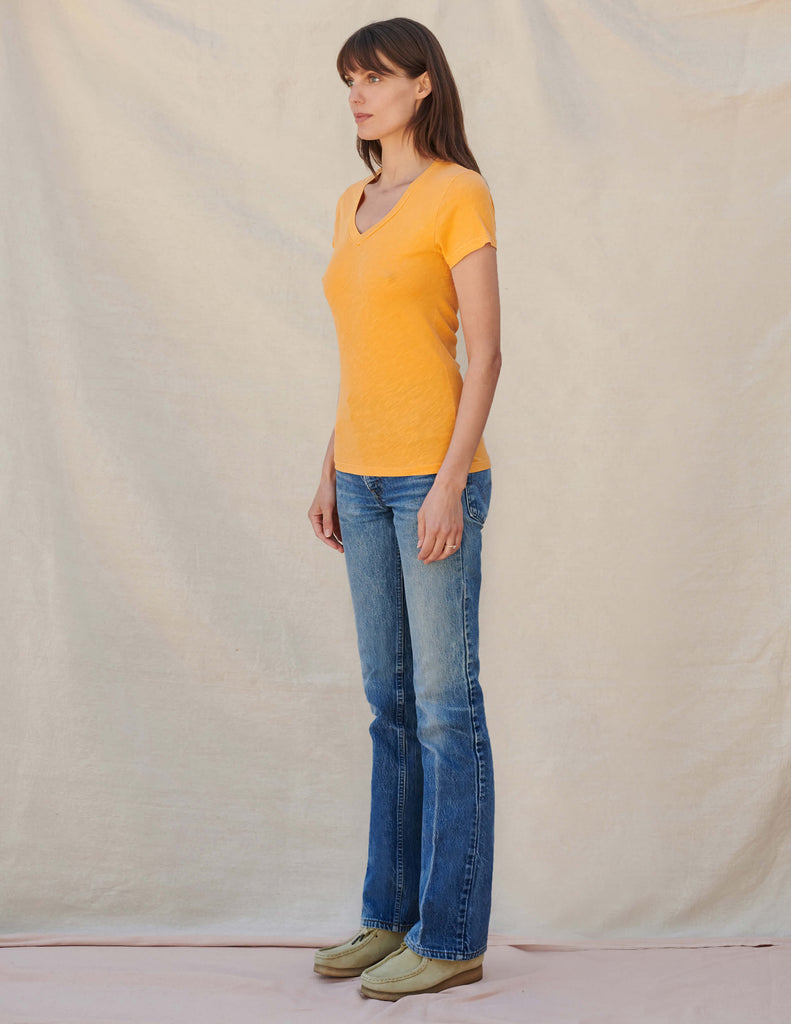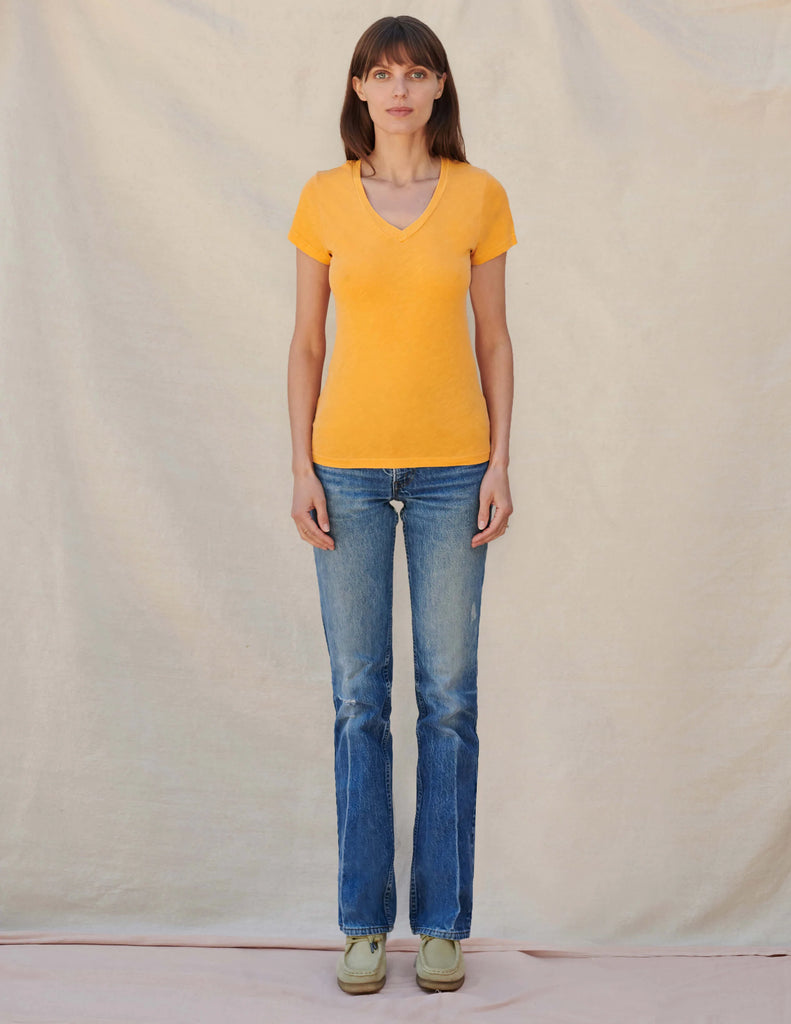 A basic v-neck tee in cotton. Featuring a center back seam. Slim silhouette.