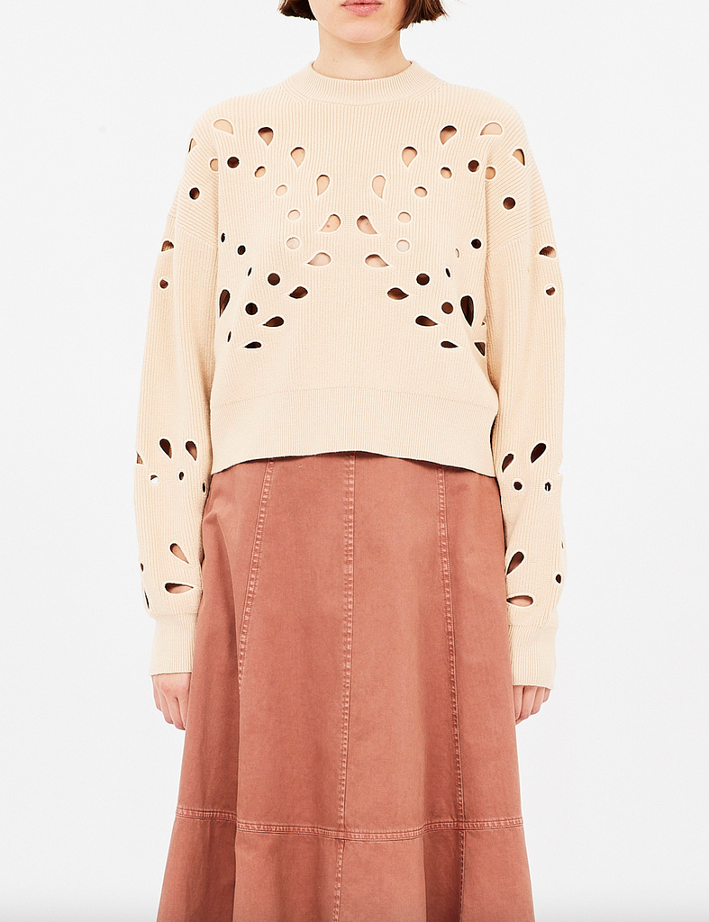 Playfully transparent, our Vanessa Pullover is ribbed from organic cotton that’s adorned with botanical eyelet embroidery drawn from a vintage Italian lace. This sweater has a classic crewneck and is a light khaki hue that easily complements your denim and tailored separates.
