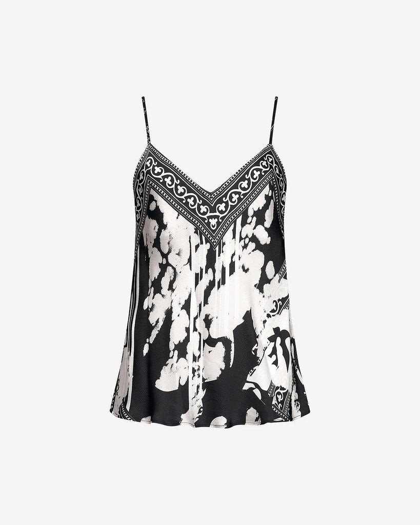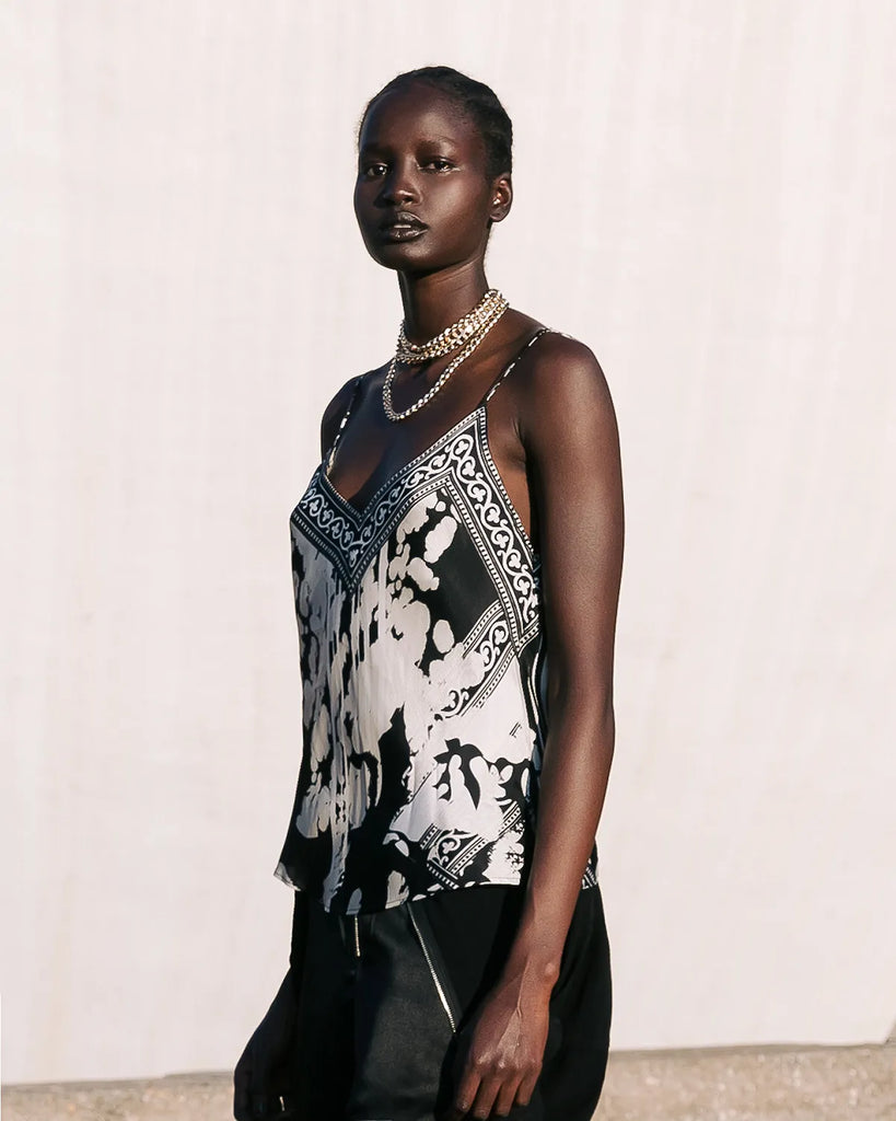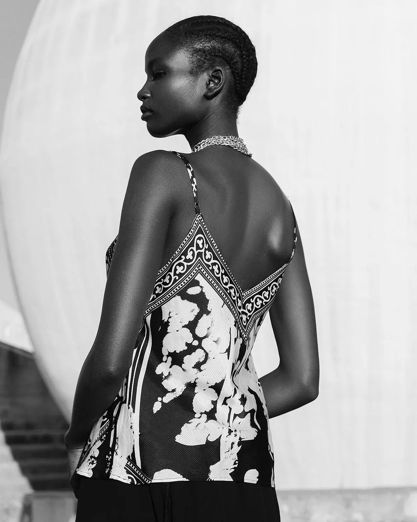 It is made of woven viscose with a bandana-style print around the neckline. The straps are adjustable for optimal comfort, its cut is slightly flared at the bottom.