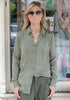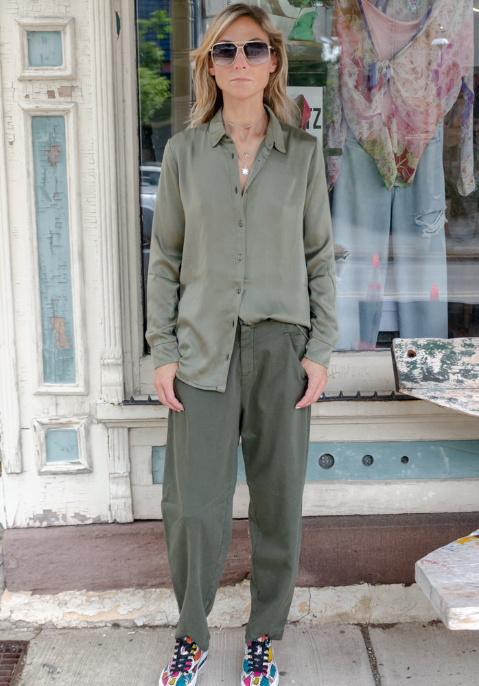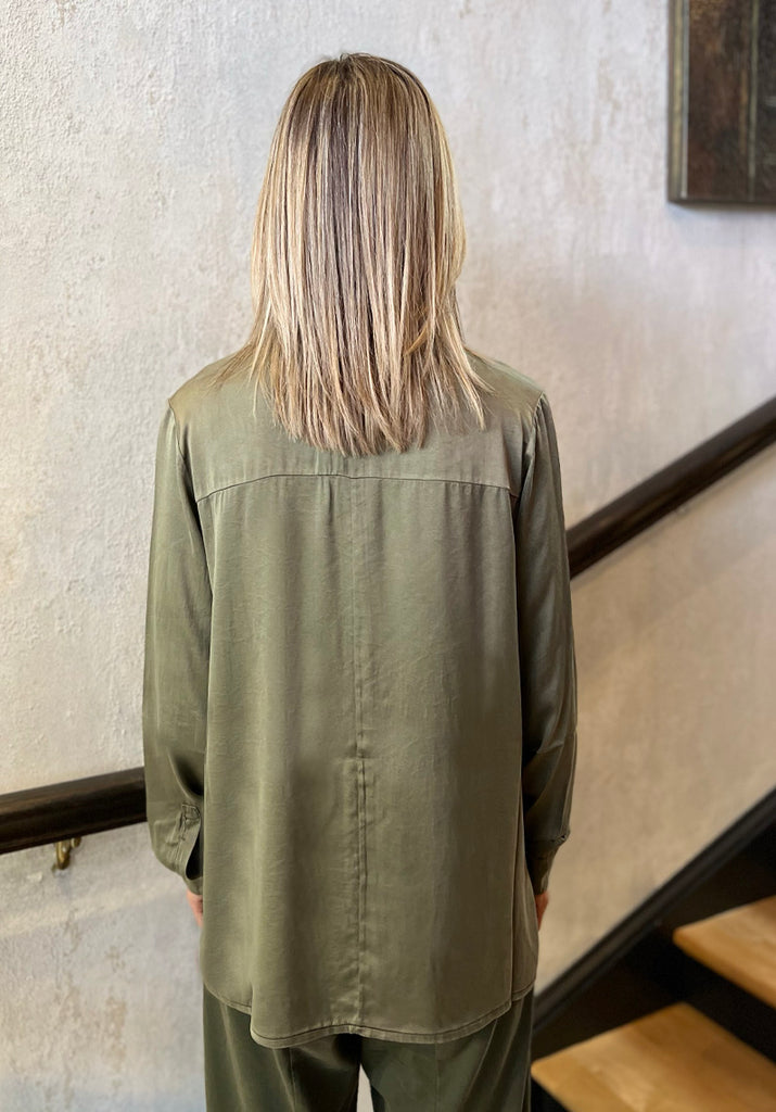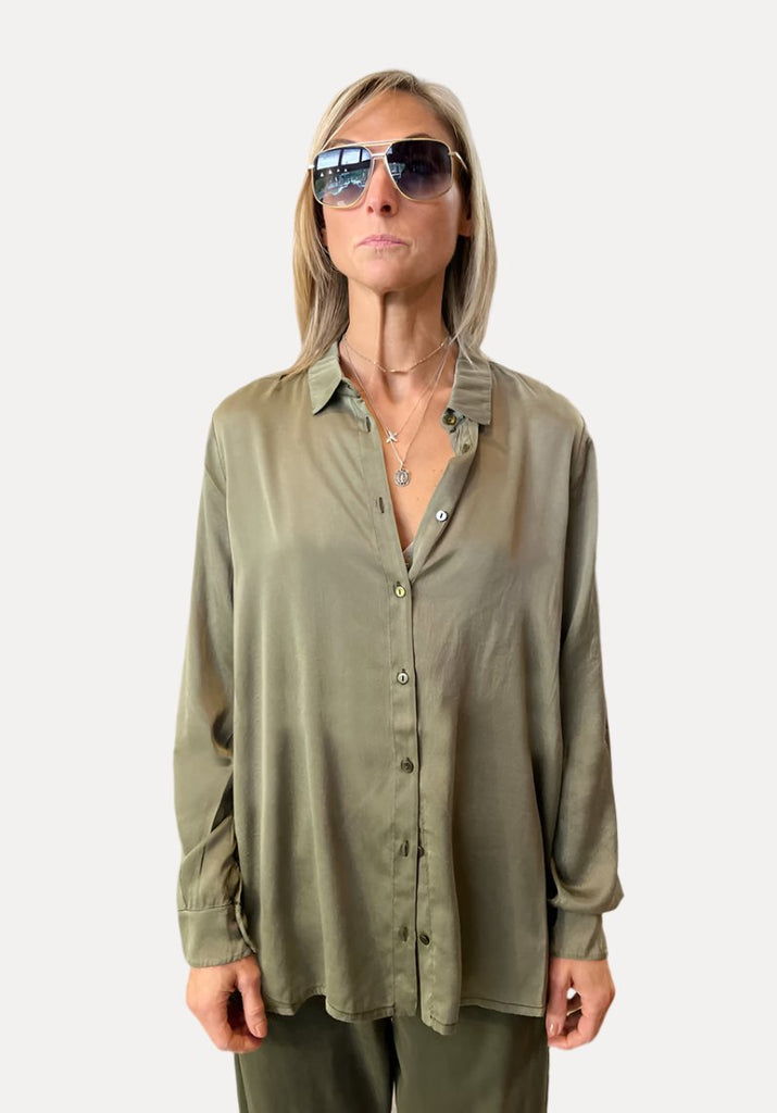 Garment dyed basic shirt made of stretch satin silk. Regular fit, straight outline. Shirt collar and fastening with buttons. Cuffs opened by two buttons. On the back yoke and central cut.