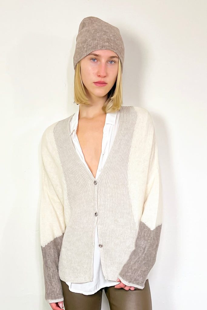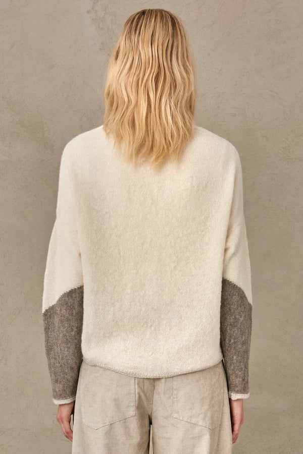 Oversized jacket in wool blend alpaca. V neckline closed by three metal buttons. Play of yarns and workmanship to create a contrasting motif on the front and on the sleeve.