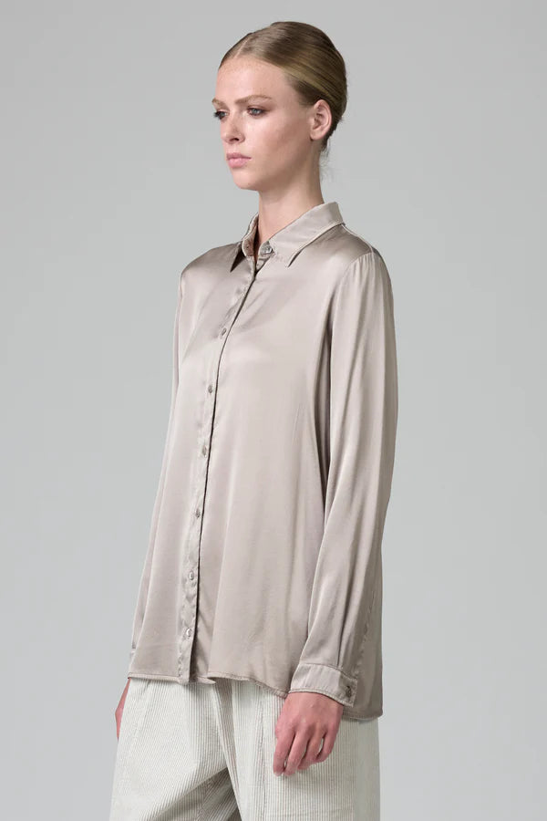 Regular-fit shirt. Made of stretch silk satin. Italian collar, buttoned cuffs, and back yoke. Garment dyed.