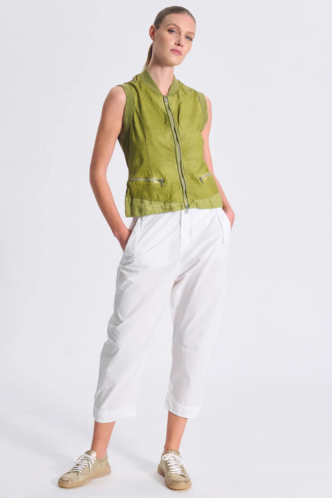 Slim fit leather vest with linen insert at the bottom and knitted inserts on the neck and armholes. Fastened with a zip. Garment dyed.