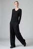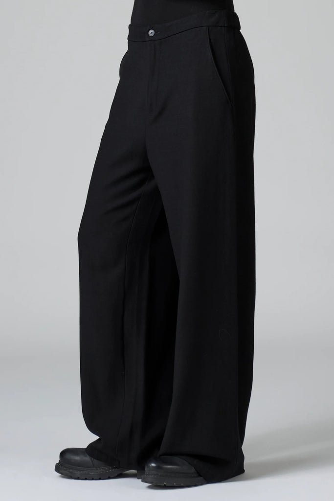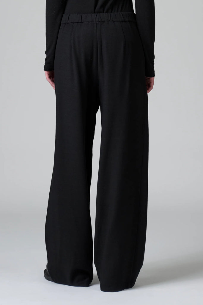 Stretch wool and viscose trousers with a fit that is close around the waist and looser on the thighs, opening up to flared bottoms. A gathered elastic back on the waistband offers enhanced comfort. Two slash pockets at the front. Fastened with a central zip and button.