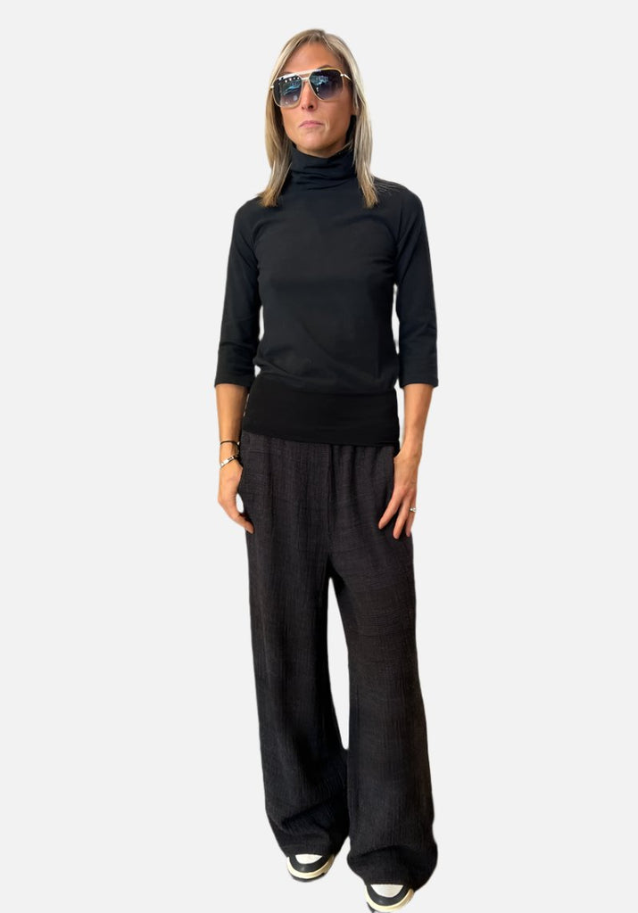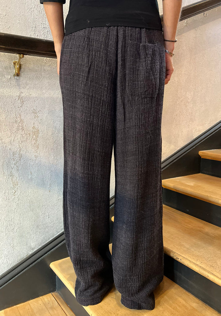 Palazzo trousers made of checked wool blend fabric with an embossed effect. Foldable jersey waistband, false opening with flap. Side seam pockets and appliqué back pocket.