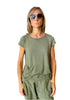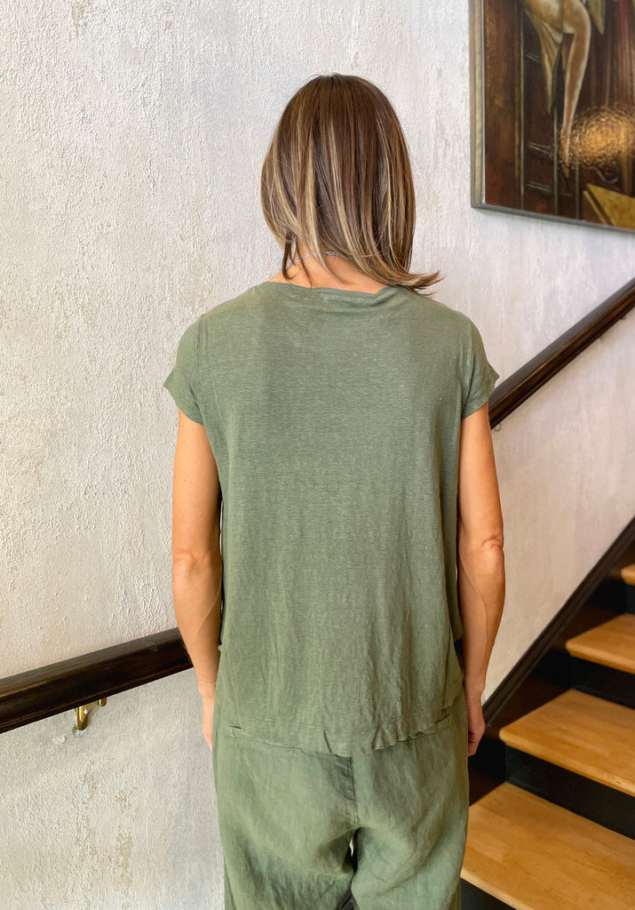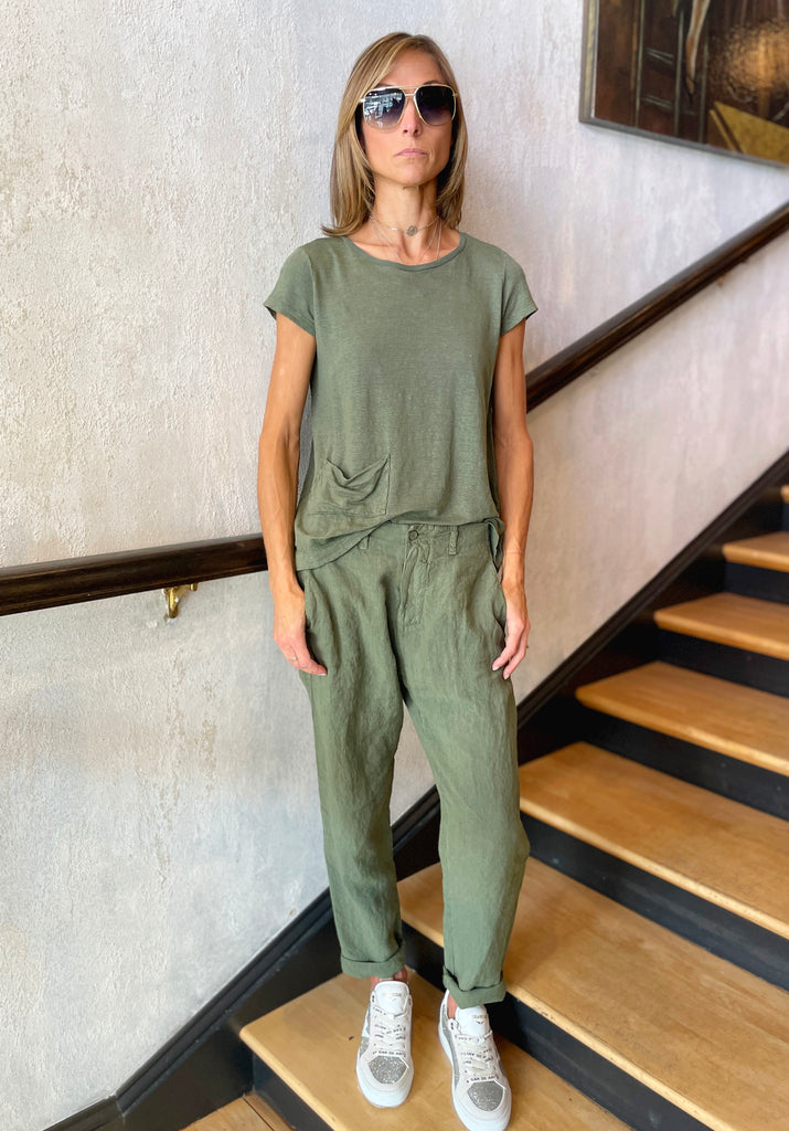Short-sleeved linen jersey t-shirt. Garment dyed. Round neck with a viscose georgette trim. Appliqué pocket.