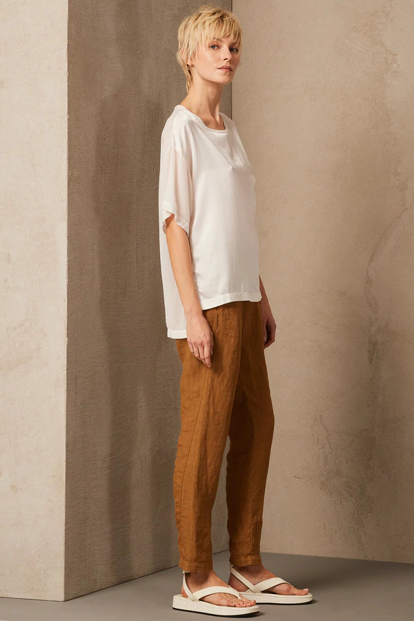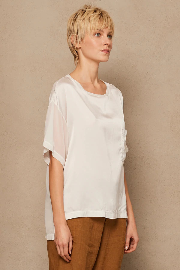 Stretch silk satin shirt, garment-dyed for an aged effect. Oversize, with low shoulders. Silk georgette inserts on the boat neck. Satin appliqué pocket on the front. Vents in the hem at the sides.
