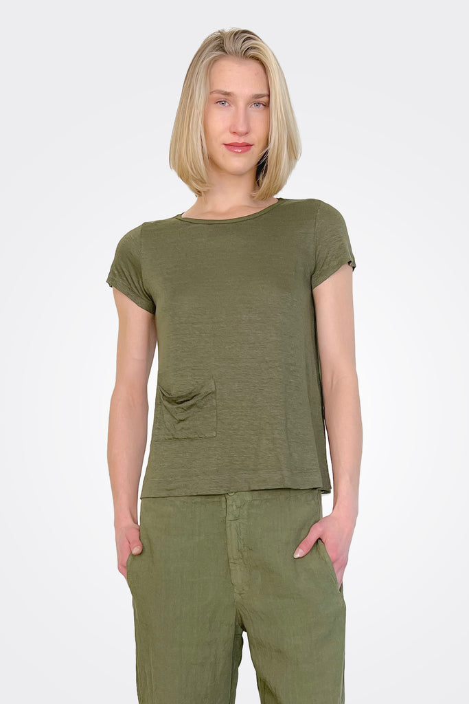This slim-fitting white tee features a pocket front made of soft linen fabric.