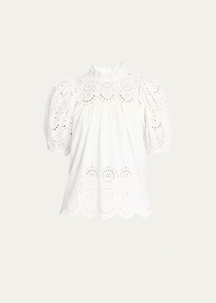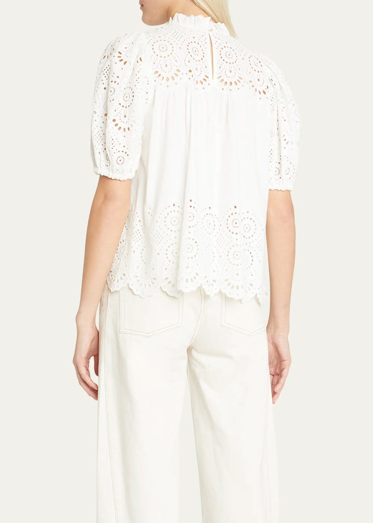 - Ulla Johnson "Mischa" broderie anglaise blouse with ruffled trim on the neckline